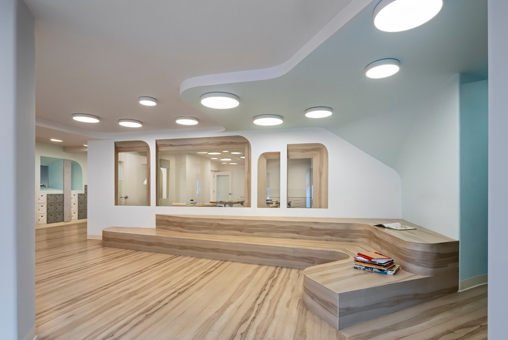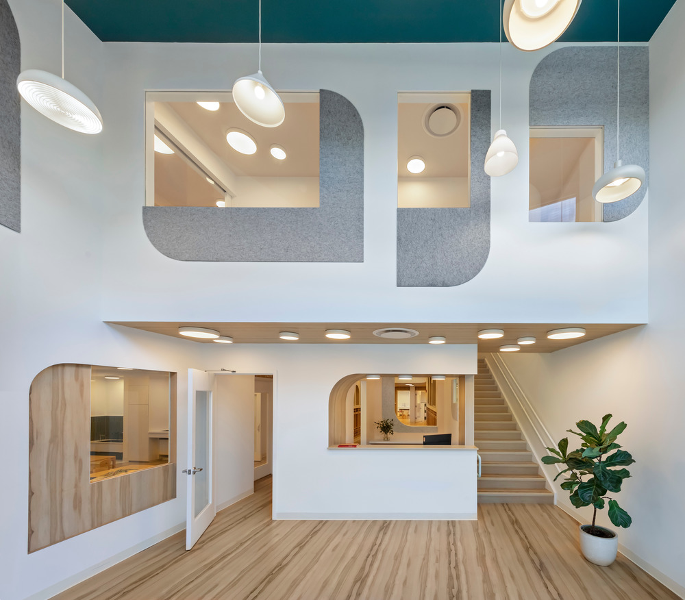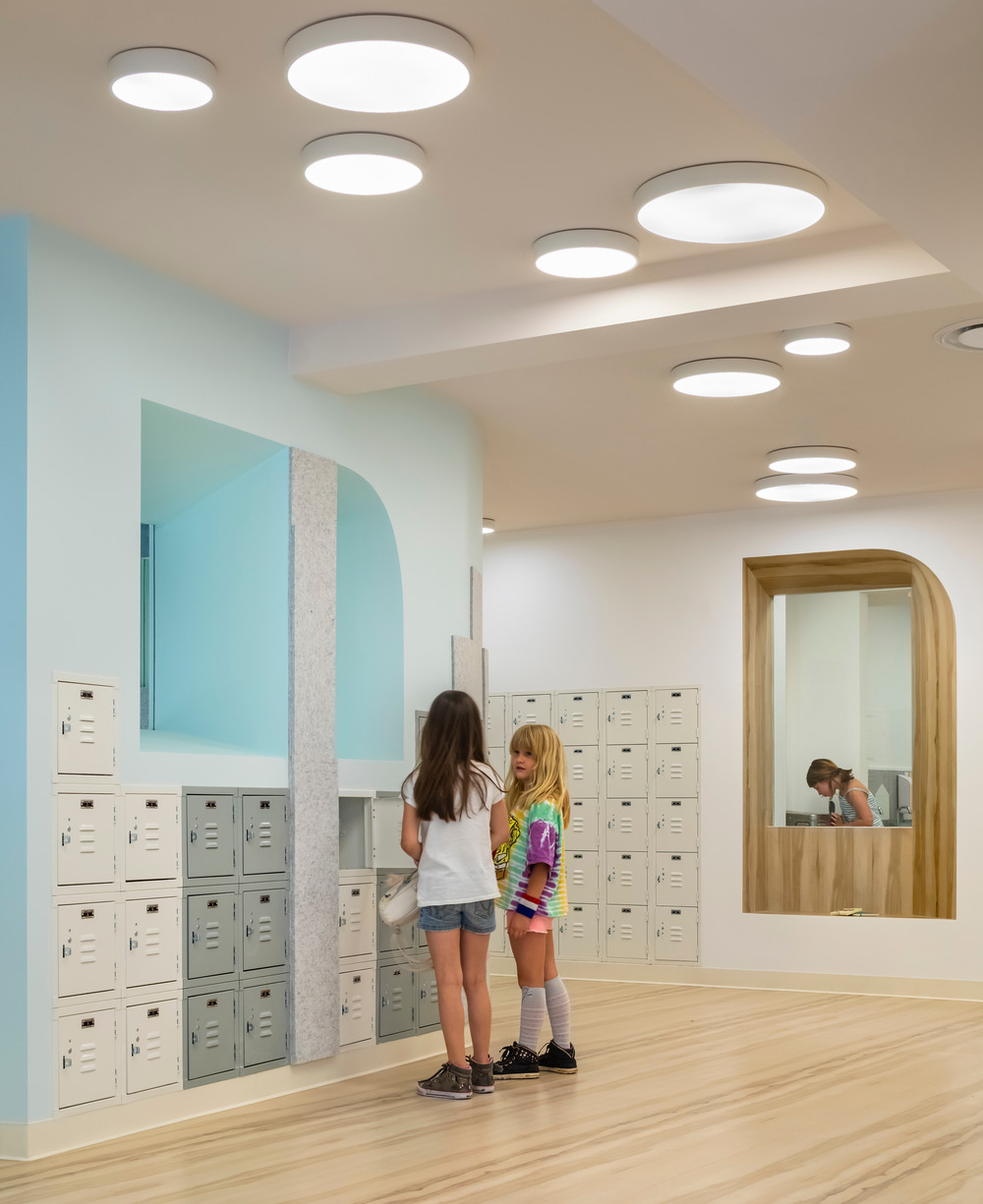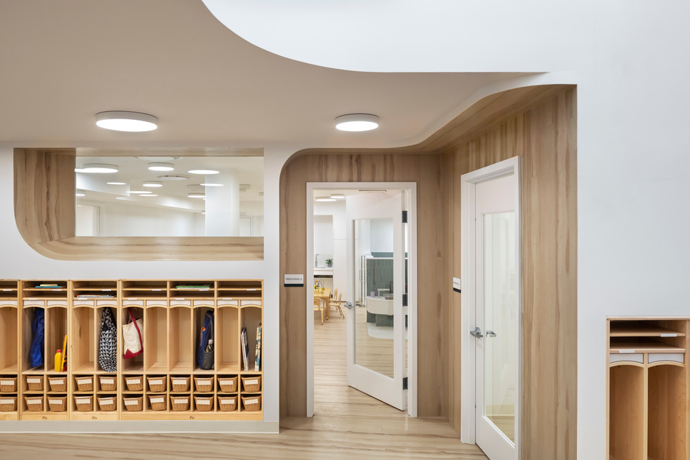 Les salles de classe spécialisées en cuisine, théâtre, STEM et mouvement sont accessibles depuis le couloir supérieur. Un salon avec des sièges de gradins offre un lieu de rencontre informel. Des luminaires de différents types et tailles sont suspendus pour créer un plan de plafond animé. Un revêtement de sol en planches est également utilisé pour envelopper les entrées des salles de classe et les fenêtres. Des panneaux de feutre acoustique, découpés en formes graphiques, apportent un intérêt visuel.
