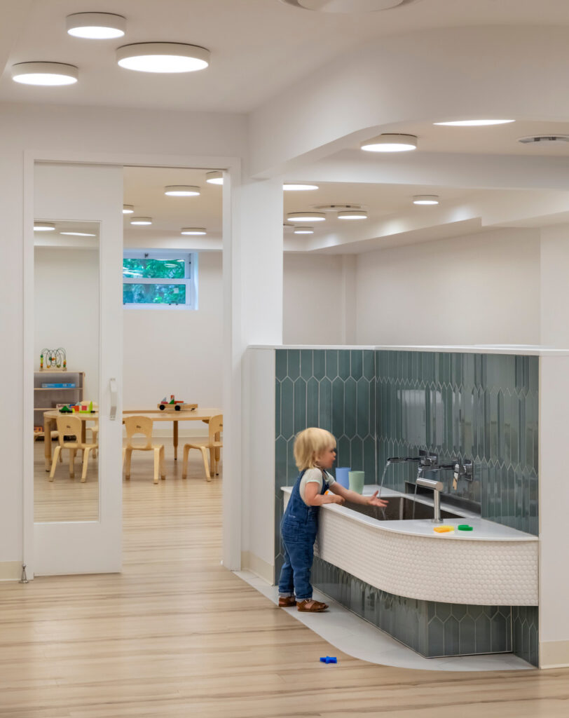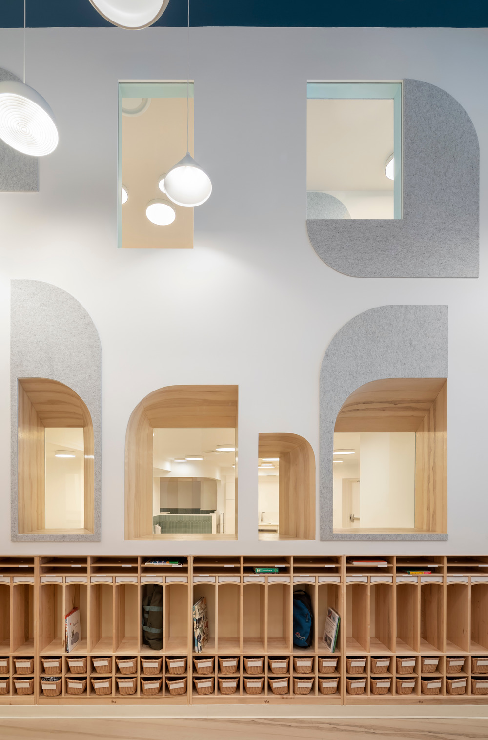 Des fenêtres de formes et de tailles différentes sur la façade intérieure permettent à la lumière d’entrer dans les espaces environnants des deux niveaux et offrent un accès visuel aux enfants et aux enseignants. Les salles de classe sont reliées entre elles par des portes doubles et des espaces partagés tels que les salles de bain et les lavabos, avec des murs à mi-hauteur qui permettent une intimité visuelle pour les enfants et une capacité de surveillance pour les enseignants.