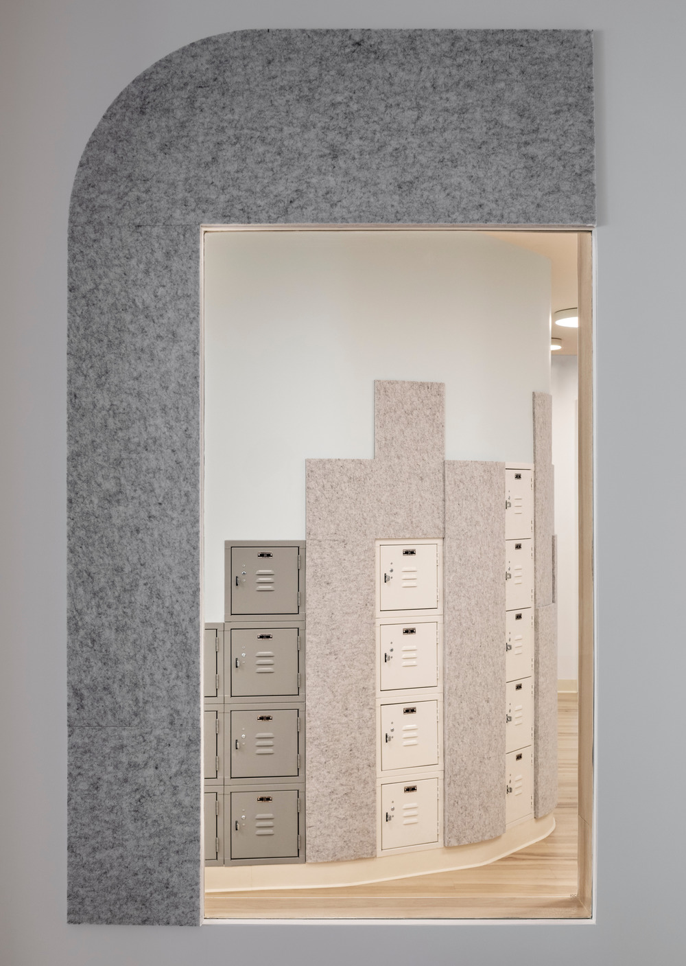 Le programme parascolaire pour les élèves de l’école élémentaire est accessible en haut des escaliers de la zone de réception. Des ouvertures apportent de la lumière et des vues sur la cour et la rue. Des casiers enveloppent le volume de la cour, sous la forme d’une ligne d’horizon de la ville.