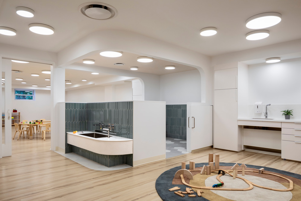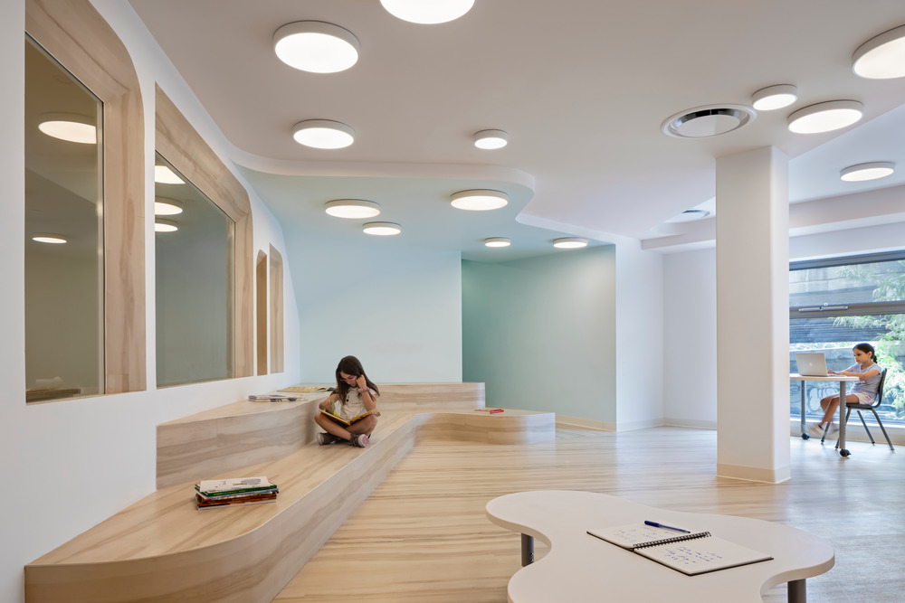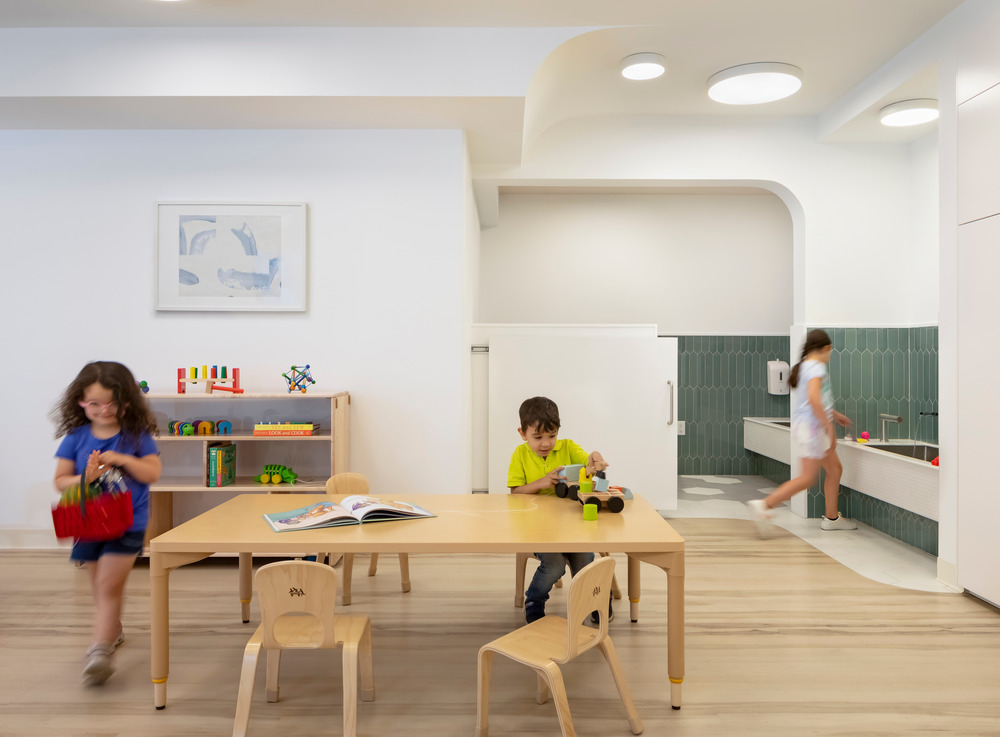 City Kids est un nouveau centre d’éducation pour enfants situé à Williamsburg, Brooklyn. Six salles de classe préscolaire s’ouvrent sur une cour centrale à double hauteur, éclairée par une grande fenêtre de magasin. La cour est dotée d’un mur plus épais qui intègre le bureau de la réception et les casiers de rangement et qui constitue un espace de rassemblement central pour les classes.