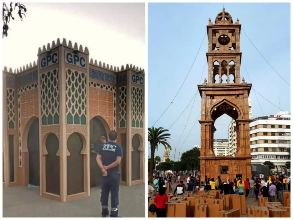 GPC Papier et Carton avait réalisé la réplique de la porte « Bab Mansour. Avec plus de 4 mètres de hauteur, cette œuvre a été réalisé avec plus de 10 tonnes de carton recyclé en engageant les équipes de GPC durant près d’un mois. Dans cette œuvre GPC Papier et Carton a mis à disposition des étudiants d’écoles d’art et architecture 1300 plaques en carton nécessaire pour la conception de la Tour d’e l’Horloge. Cette construction sera entièrement recyclée par GPC papier et carton, sur son site de Kénitra.