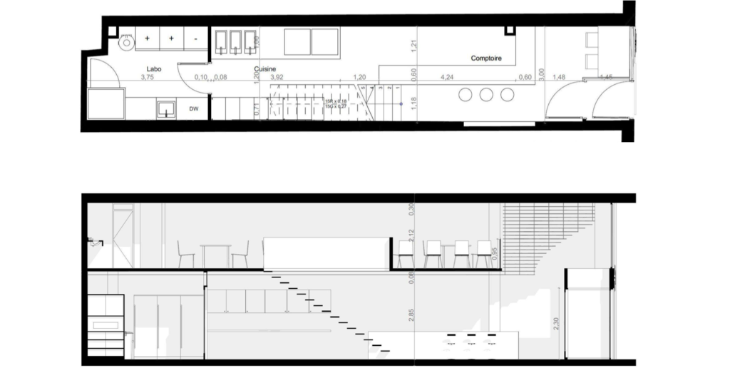 Un blanc limpide et clair, vous remettra les idées en place et créera l’espace et le recul nécessaire pour les usagers. Ainsi dans cet espace tout en longueur, l’architecte à sur ici, créer le recul nécessaire à la bonne circulation ; transformation ainsi cet espace en comptoir de dégustation et d’attente.