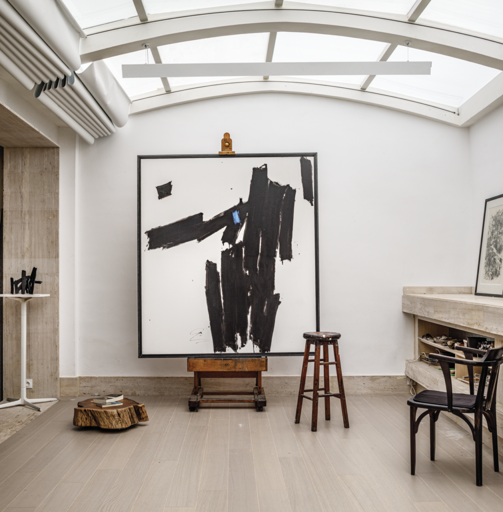 Ainsi, dans une vision dichotomique, le studio devient le temps d’un instant une expérience spirituelle frénétique et intemporelle. Ponctuée au rythme des coups de pinceaux drus de l’artiste, l’espace invite à la contemplation et au recueillement.