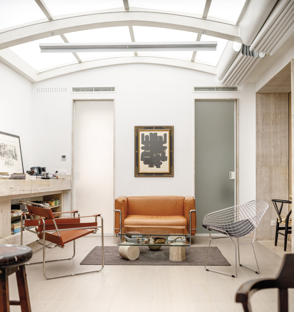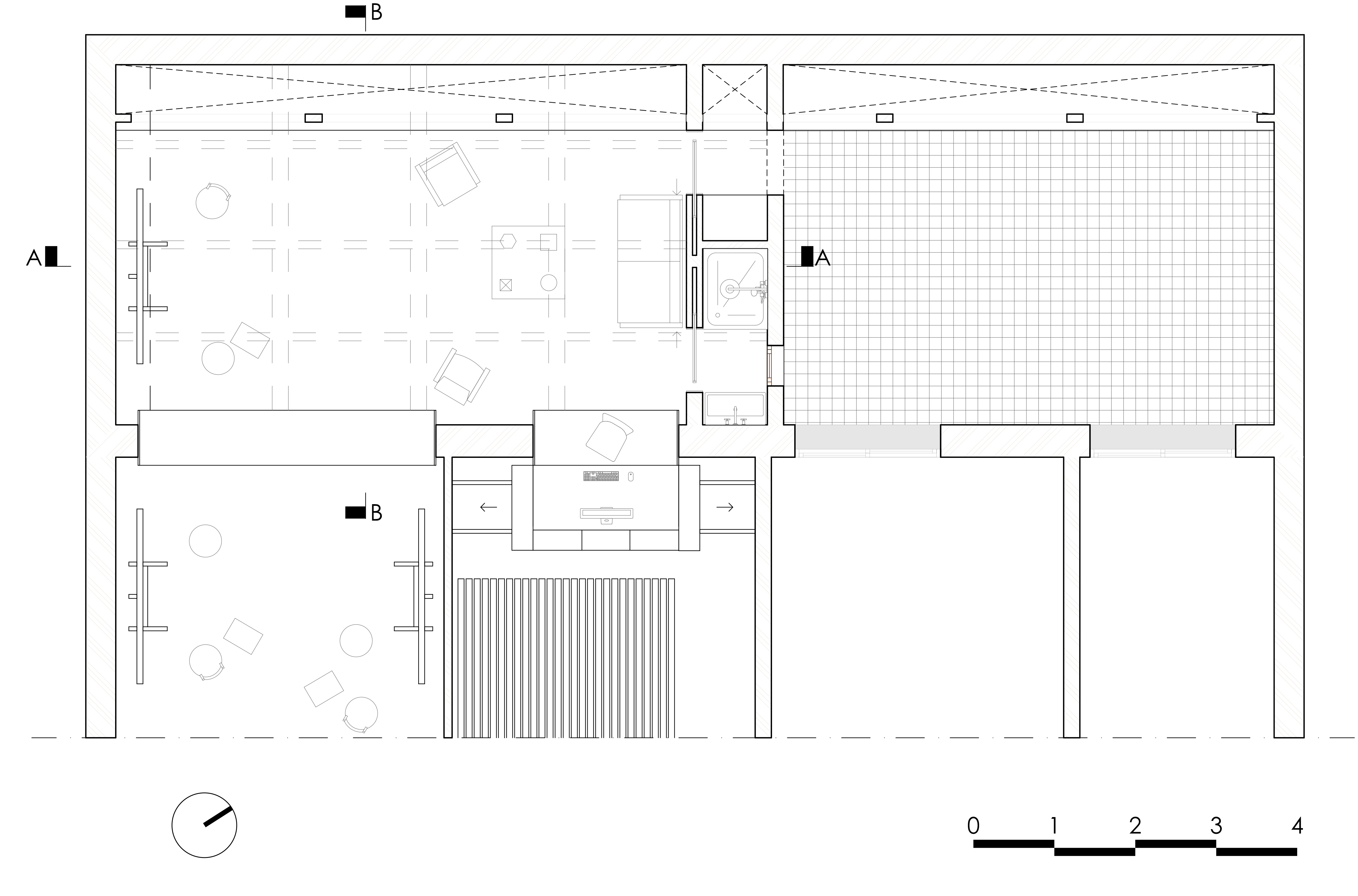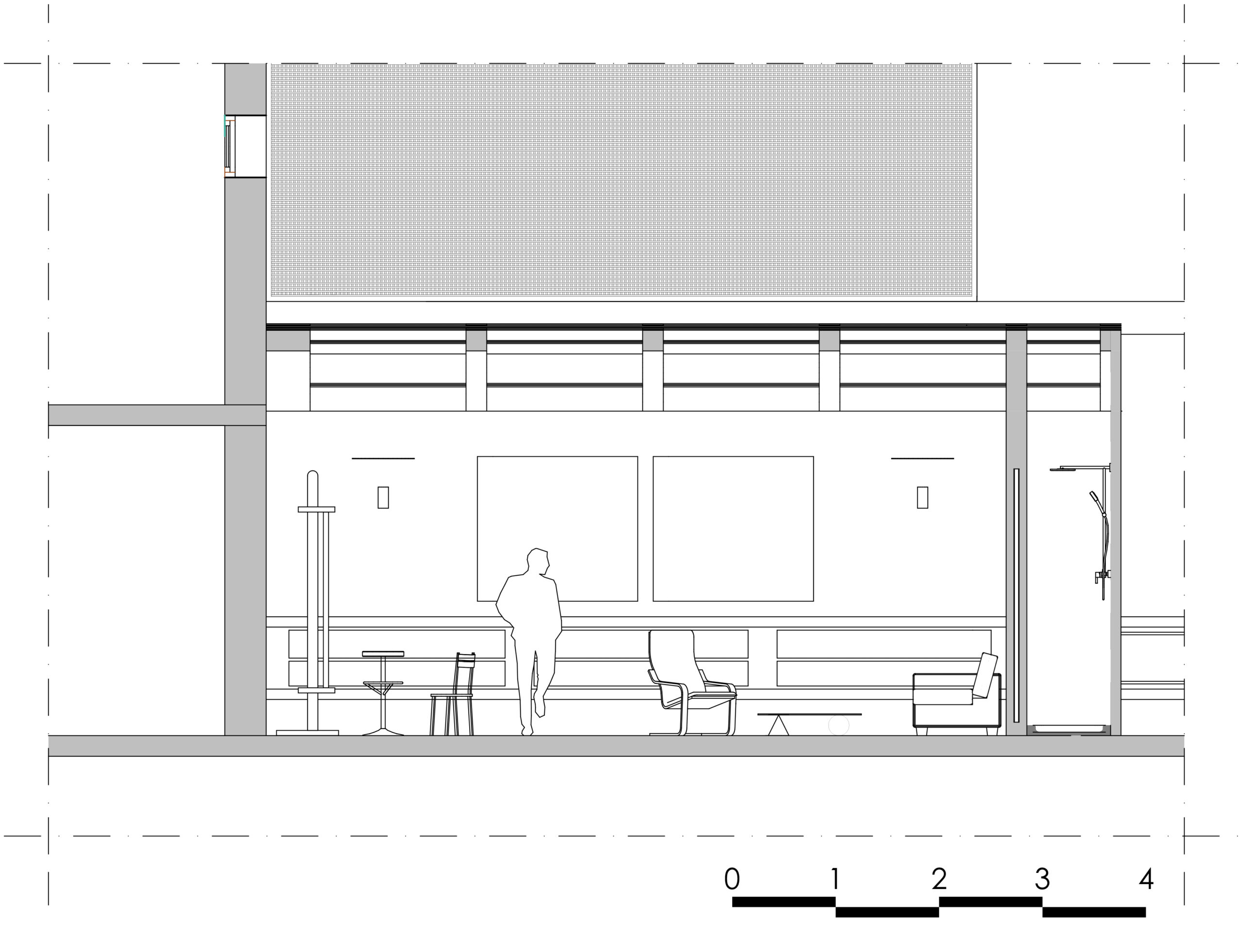 Le Rabi’s Artist Studio consistait dans un premier temps à la réhabilitation d’une terrasse technique esseulée. La proposition architecturale étant d’occulter celle-ci avec un plafond vitré de forme concave. La verrière a été assemblée par le biais d’une armature en métal thermolaqué afin d’en préserver l’intégrité. Cette dernière a été complétée par des panneaux en verre trempé à chaud dans le but d’en augmenter la résistance et la solidité. En termes de programmation, l’atelier comporte un espace de travail, un espace bureau, un salon, un espace de rangement et une salle de bain.