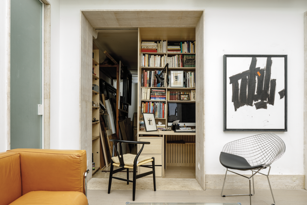 La résultante spatiale devient le réceptacle d’une lumière diffuse et confortable, adaptée à l’usage auquel elle se prête. La matérialité du projet constitue le prolongement d’une réflexion architecturale impavide et dénuée de superflu. Les sols ont été revêtus d’un parquet en chêne aux teintes claires. En outre, les espaces de rangement sont accentués par le biais d’un marbre granuleux et poreux. Les pièces de mobilier, quant à elles, ont été sélectionnées et disposées avec soin. À l’image d’une œuvre de Rabi’s, ces dernières sont à la fois structurées de part leurs coloris, textiles et configurations, mais également subjuguées par le blanc originel de la pièce.