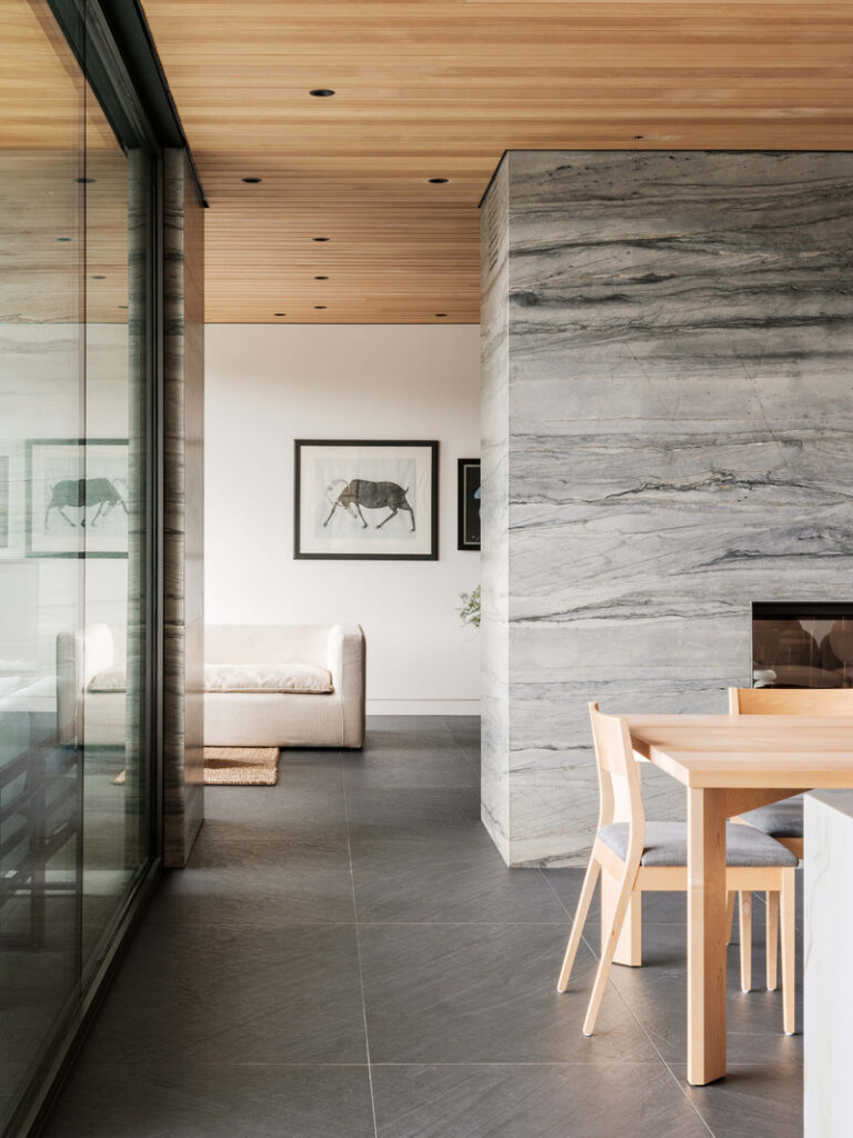 Dans la section foyer, on y trouve le sectionnel Tube, vêtu d’un tissu molletonné beige, accompagné par la Table Tronc en béton. Assis sur le tapis Hemp, ces morceaux s’agencent bien au décor environnant, caractérisé par l’imposant foyer en pierre et le plafond en bois de pruche de l’Ouest canadien.
