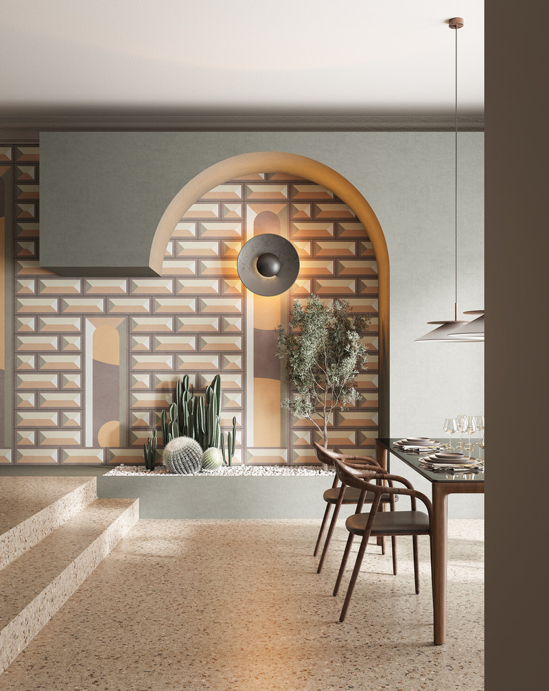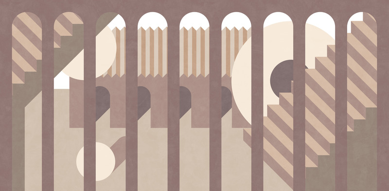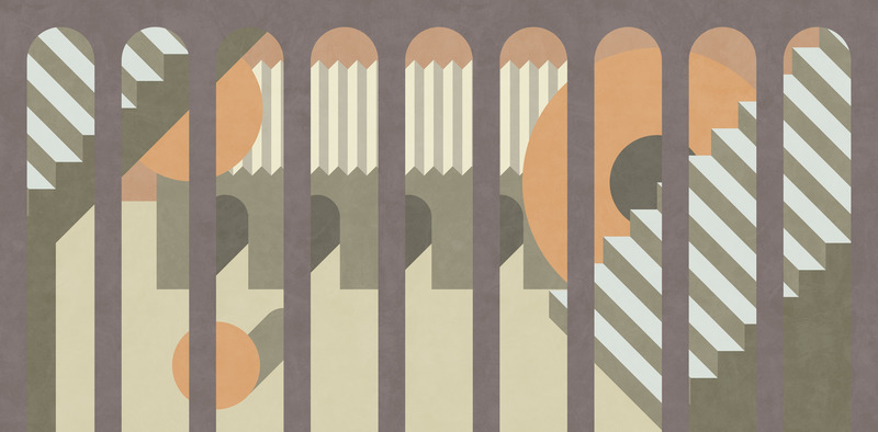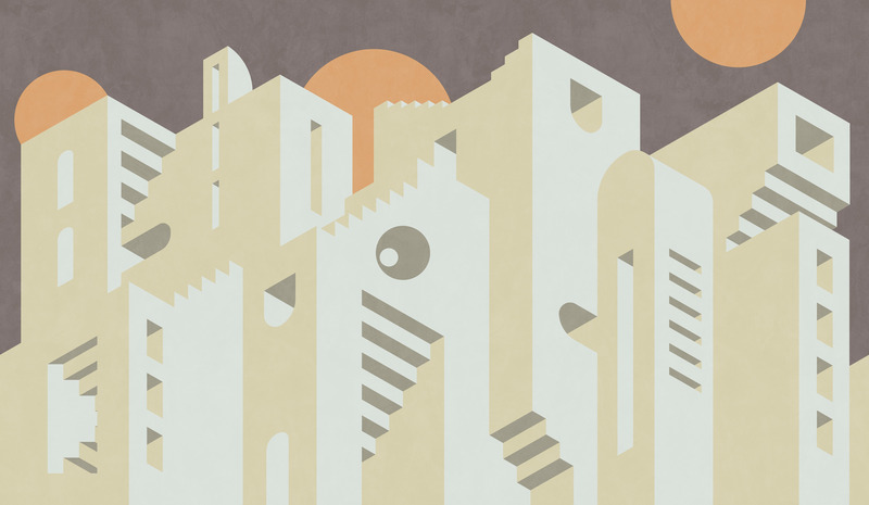 Le fil conducteur des quatre motifs créés par l’atelier de création pour la collection Flow réside dans la réflexion sur la relation entre l’intérieur et l’extérieur en architecture. Les graphismes d’Archscape et de Metropolis évoquent la ville du point de vue de ceux qui préfèrent l’admirer de loin, depuis l’intérieur de leur maison sans s’en approcher trop. On y trouve des volumes, des escaliers, des fenêtres, des jeux de lumière et des ombres portées sur les murs des bâtiments. C’est une métropole animée mais qui possède une dimension presque mystique et rêveuse.
