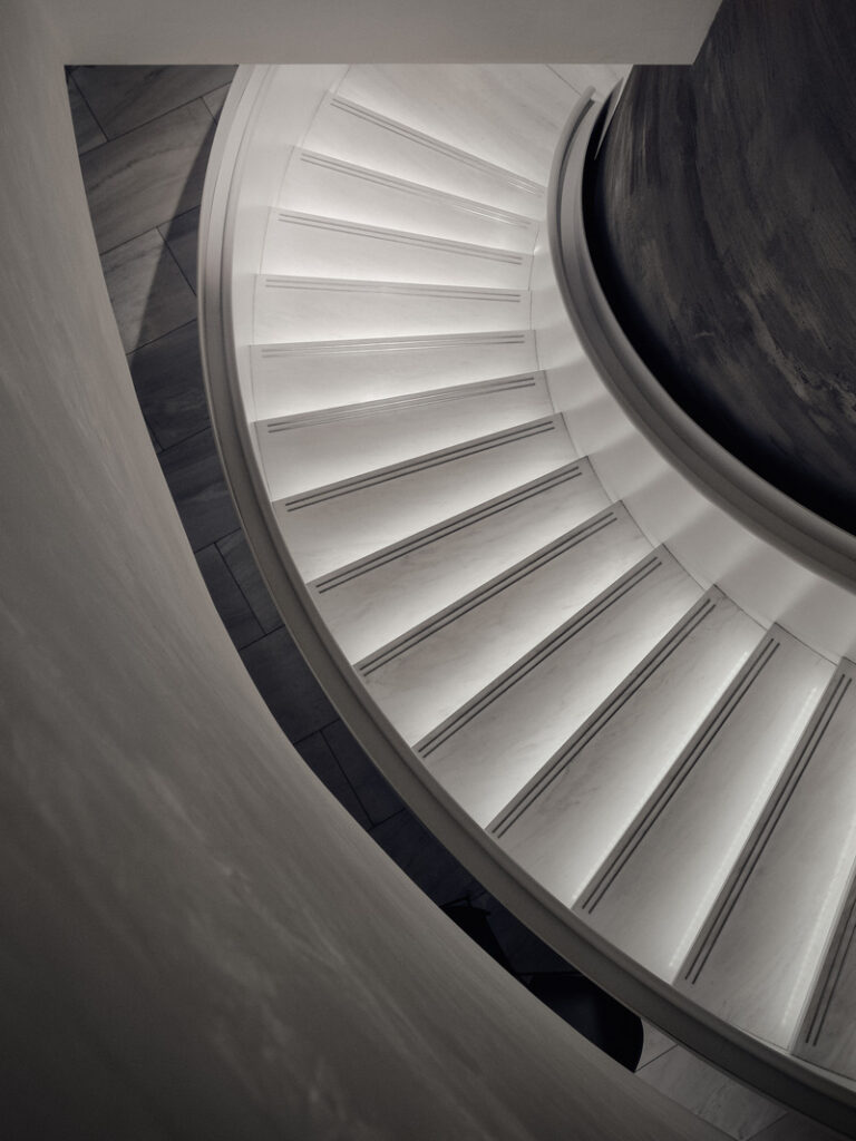 Le point le plus élevé de ces trois zones est celui du palier d’arrivée de l’escalier. Cette stratégie garantit que la totalité de l’espace est perceptible par les invités dès leur entrée. D’une certaine manière, cela fait écho aux paysages en pentes de plusieurs structures villageoises des îles grecques.
