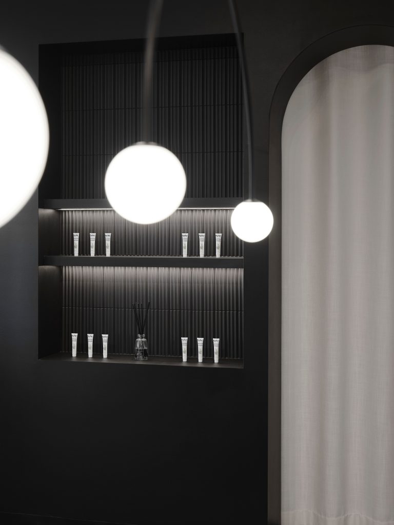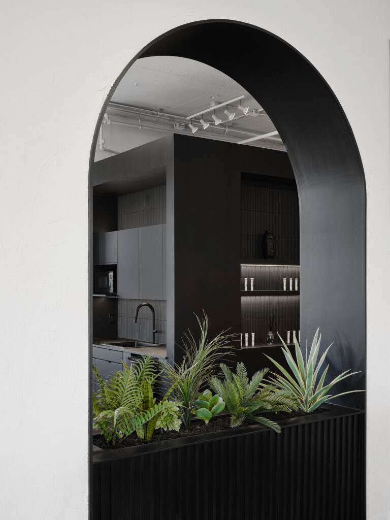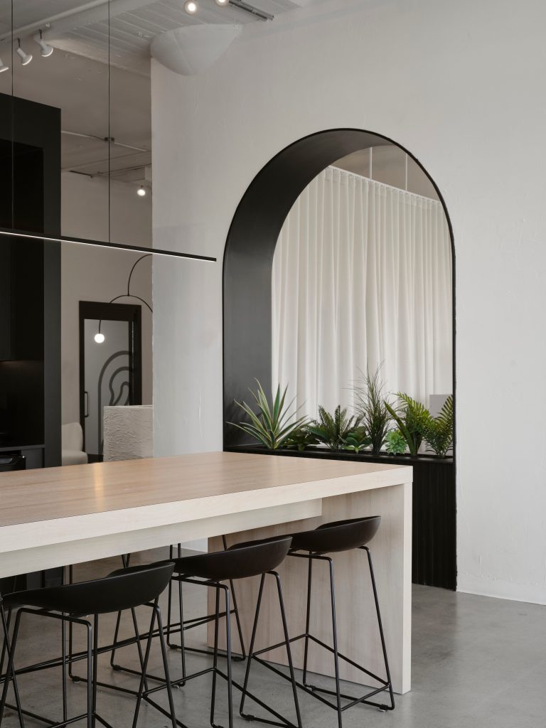Tel un tatouage sur la peau, l’aspiration à intégrer des éléments sombres distinctifs au sein d’un univers plus clair a guidé la réflexion des concepteurs et le contraste est devenu l’un des piliers fondamentaux du concept. Ainsi, bordant l’entrée et la zone lounge, un cube architectural noir abrite avec élégance toutes les fonctions utilitaires du studio : rangement, vestiaire, cuisine et présentoirs de vente. Trois arches noires, marquant l’entrée dans l’espace de création, reprennent subtilement les courbes du logo et permettent également d’avoir une vue sur les artistes à l’œuvre depuis l’espace détente.