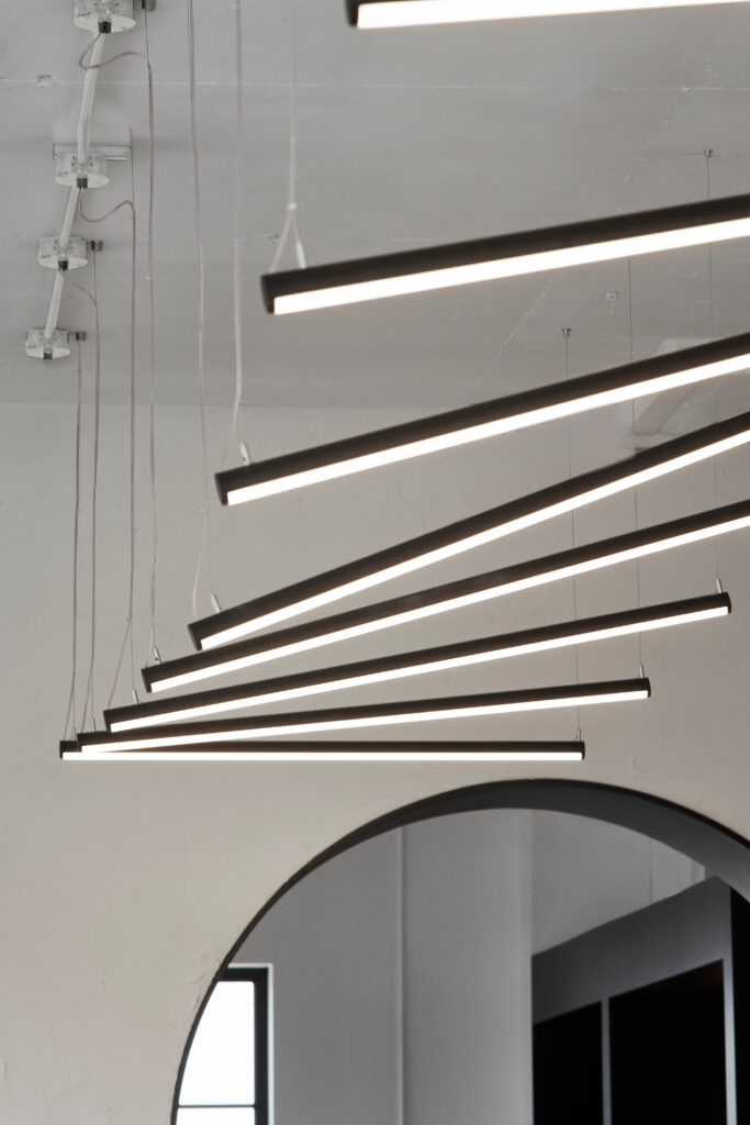 Véritable œuvre d’art, ce ruban d’acier brut qui ondule délicatement enveloppe avec élégance le meuble d’entrée. De plus, un enchevêtrement de différentes matières, tel que le plancher en béton, les textiles du tapis et des fauteuils visiteurs, ainsi que les différents miroirs contribuent à parfaire cette composition éclectique de matières qui accueille les visiteurs dans un univers tout à fait singulier. L’ensemble s’inscrit comme une véritable invitation à explorer ce lieu unique.