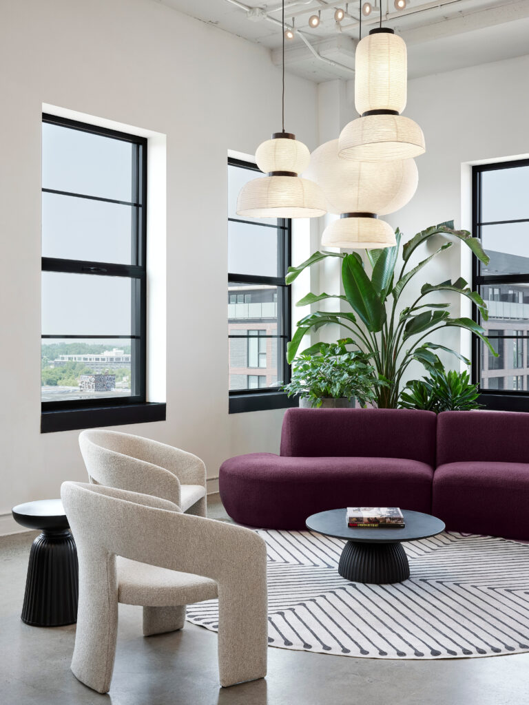 Au cœur du projet, la zone lounge souple et accueillante est caractérisée par des meubles aux formes courbes et un éclat de couleur prune qui ajoute une touche de vivacité tout en contrastant avec la végétation présente dans l’espace. C’est dans ce lieu, baigné d’une lumière naturelle abondante, que tatoueurs et clients se rassemblent pour collaborer, échanger et se détendre dans une atmosphère agréable et propice à la créativité.