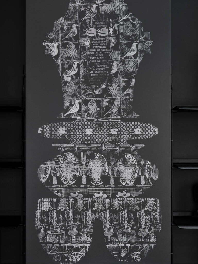 L’artiste François Morelli s’intéresse aux notions de passage, de circulation et de transformation, produisant un dessin mural, qui met en relation l’architecture, le lieu habité (la Maison Noire) et l’intervention artistique. La cheminée est le canevas d’une œuvre réalisée sur place par Morelli, dans la tradition du home wall drawing.