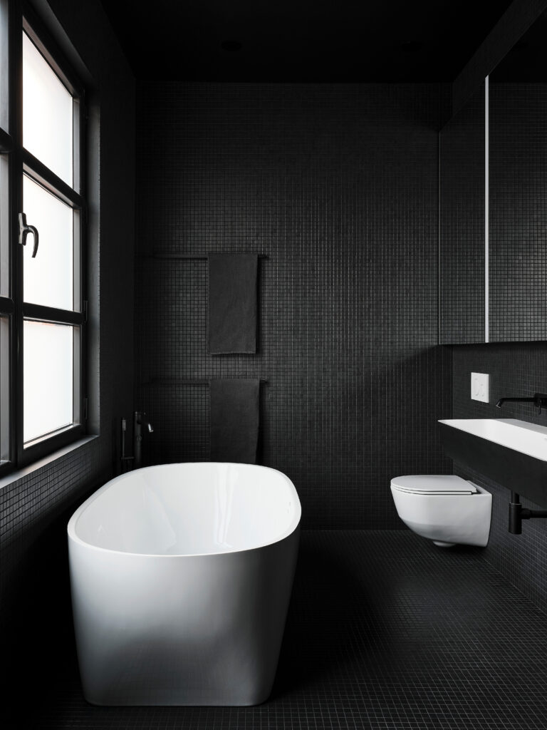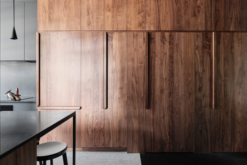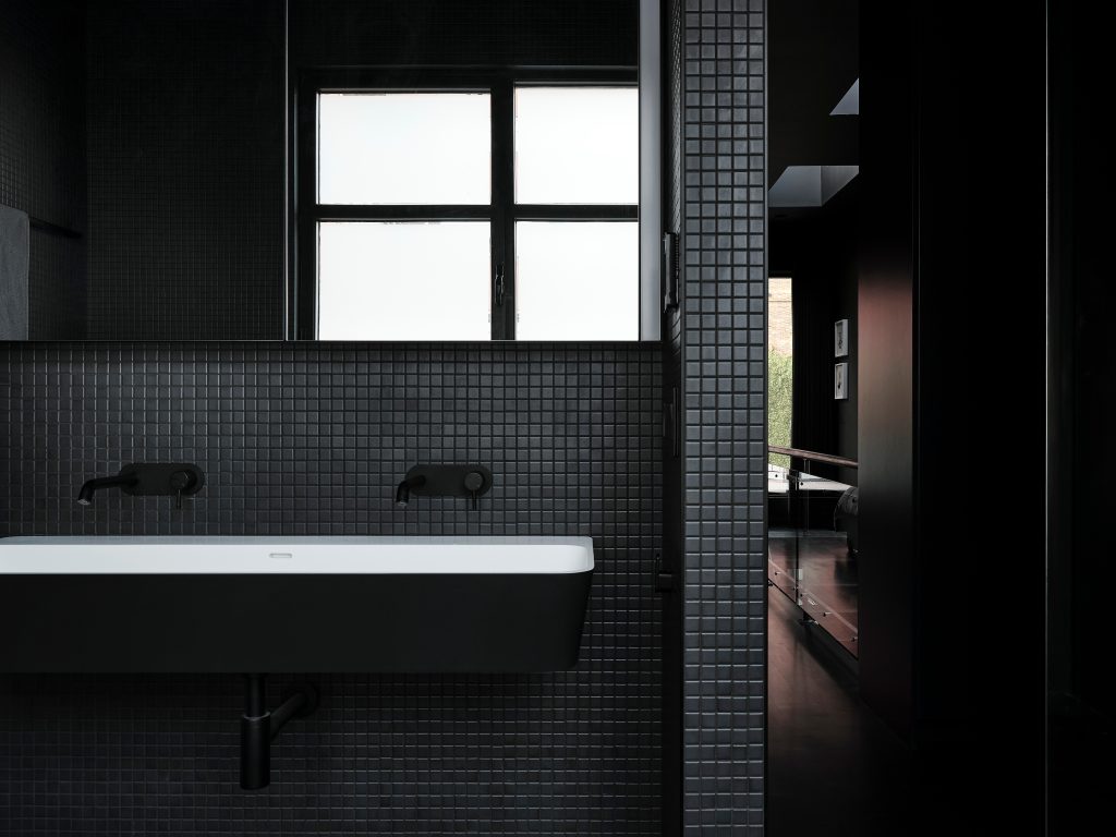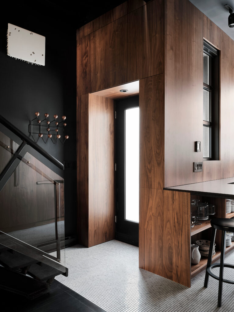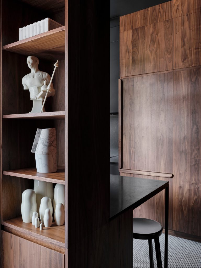 Le choix du noir permet d’amplifier l’effet de théâtralité, en faisant cohabiter des pièces fortes du design d’hier et d’aujourd’hui, dans une signature visuelle apaisante, riche et encore peu utilisée dans des intérieurs résidentiels. Le mobilier comme les oeuvres se fondent alors dans un écrin neutre, rehaussé parfois par du blanc, et du noyer noir.