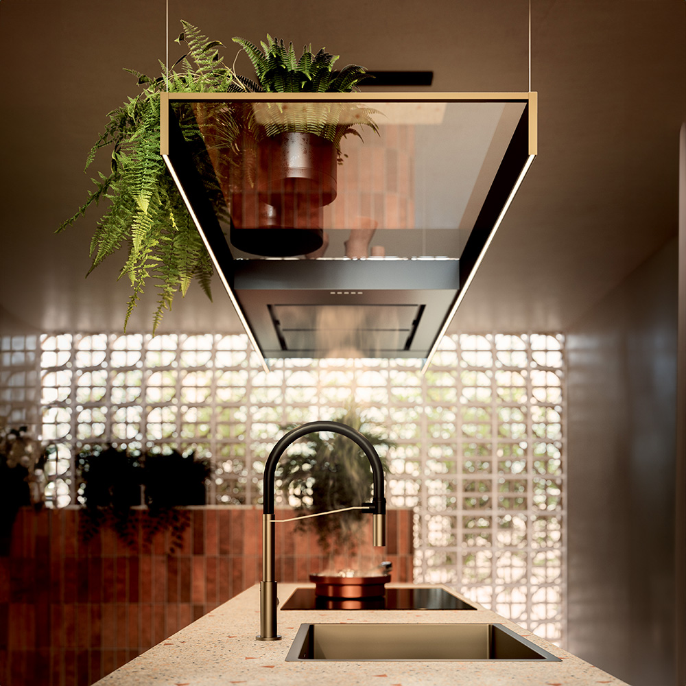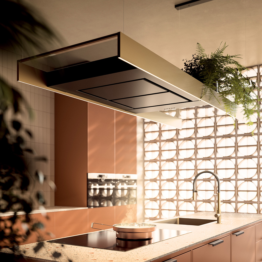Conçu pour une installation en îlot, Light Bronze reste surélevé au-dessus de la table de cuisson, permettant une vue ouverte et plus large, mettant également en valeur les autres éléments. À la fois élégante et distinctive, cette hotte présente l’avantage unique de pouvoir être installée en mode filtre, sans nécessiter de conduit.