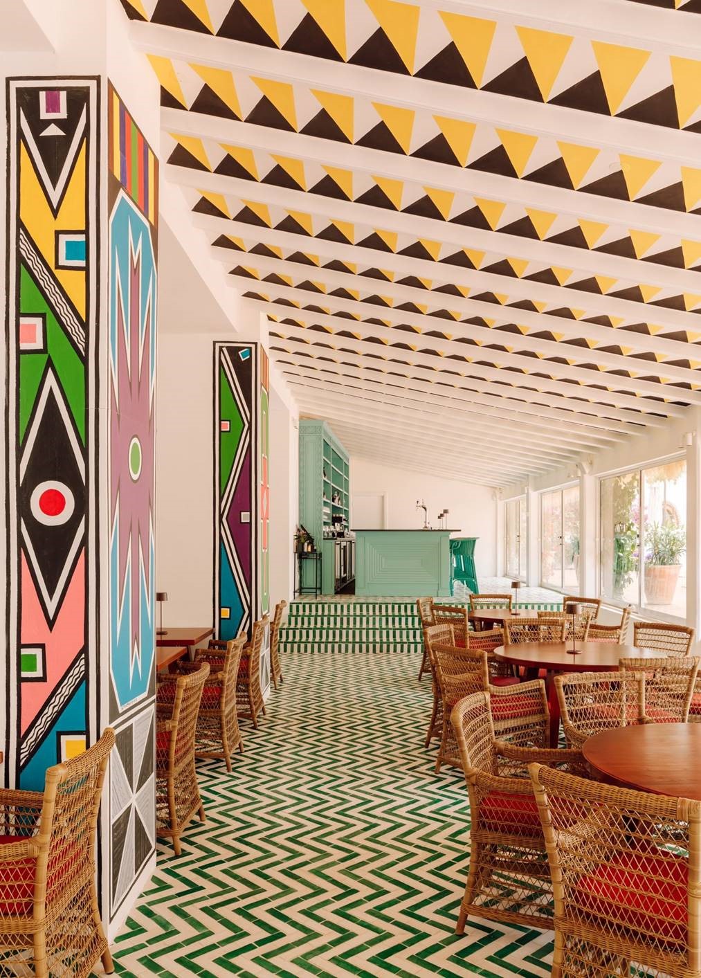 Cette rencontre artistique a insufflé à Mahlangu le pouvoir de peindre les colonnes du restaurant, offrant ainsi une fusion harmonieuse entre l’art ancestral africain et l’élégance intemporelle du décor faisant de ce restaurant une expérience visuelle et gustative inoubliable.