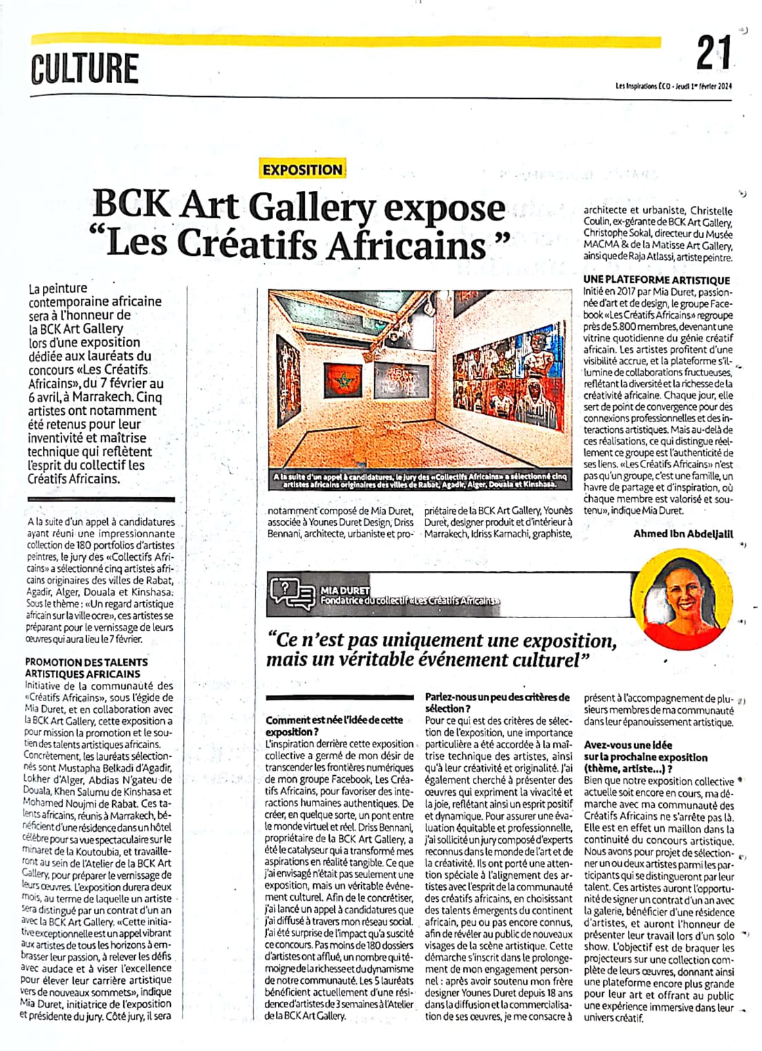 La peinture contemporaine africaine sera à l’honneur de la BCK Art Gallery lors d’une exposition dédiée aux lauréats du concours «Les Créatifs Africains», du 7 février au 6 avril, à Marrakech. Cinq artistes ont notamment été retenus pour leur inventivité et maîtrise technique qui reflètent l’esprit du collectif les Créatifs Africains. (…)
