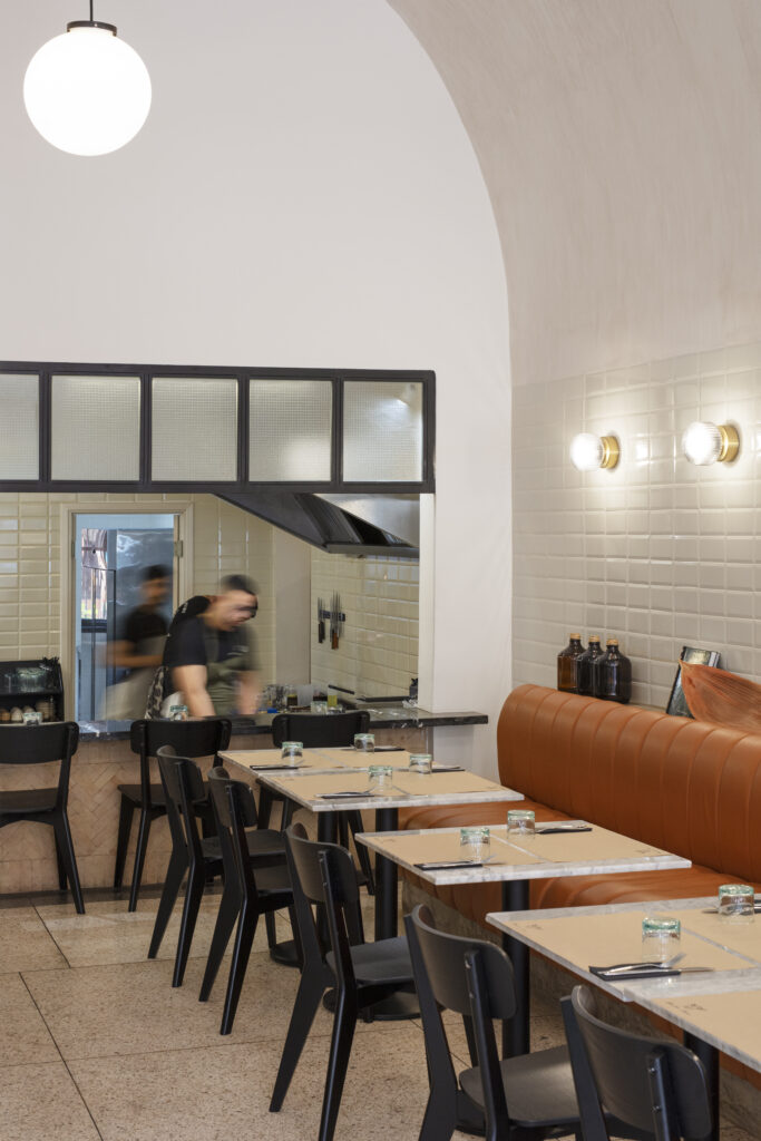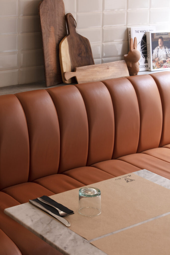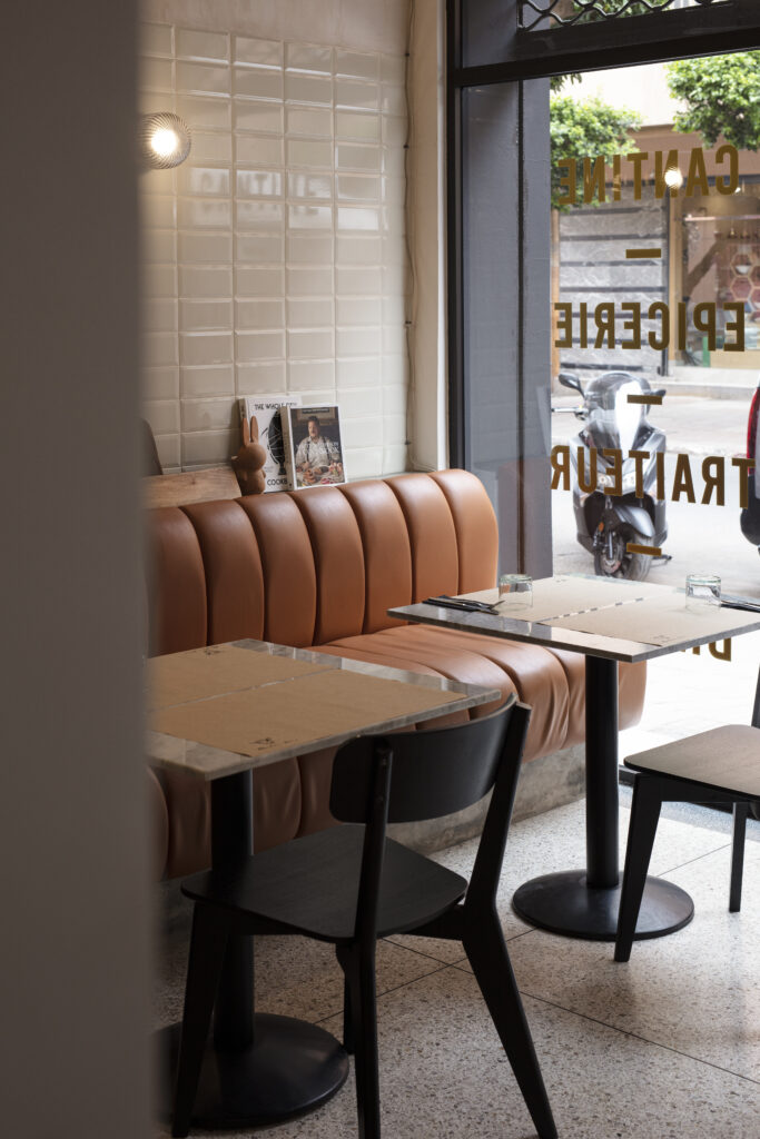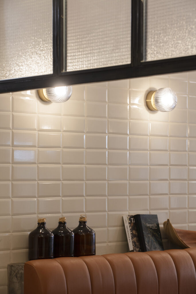 Les détails matériels ajoutent une dimension sensorielle à l’ensemble. La banquette orange, juxtaposée aux carreaux métro blancs, génère une atmosphère feutrée et accueillante. Les suspensions dorées aux inspirations rétro, éclairent l’espace d’une lumière tamisée, ajoutant ainsi une touche intemporelle à l’esthétique du lieu.