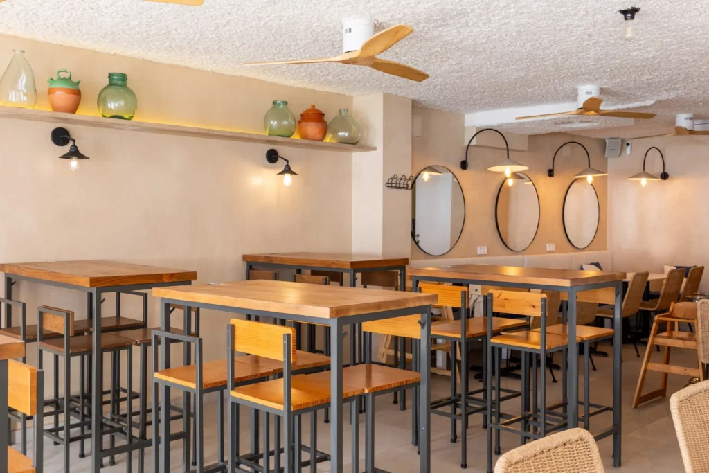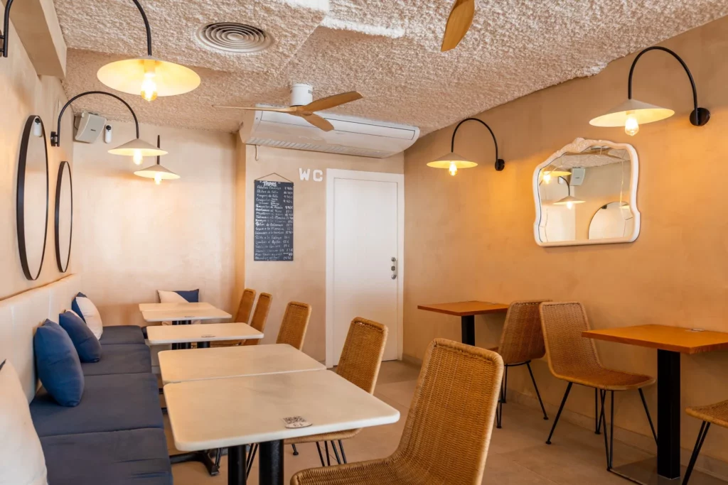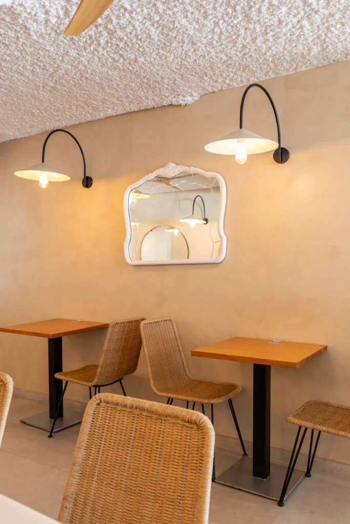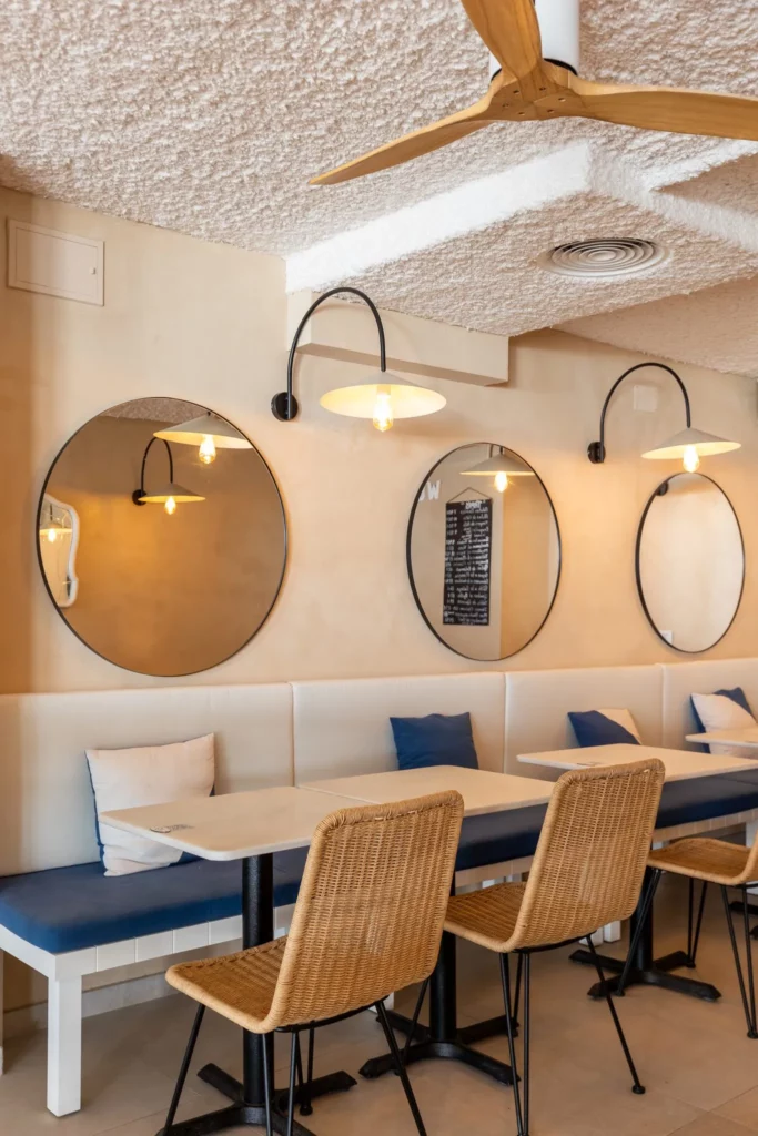 Les murs en micro-ciment de couleur sable, associés à du mobilier réutilisé d’un autre commerce et à des détails comme des miroirs ronds, ont permis de créer un ensemble harmonieux. Le design intérieur du restaurant devait être attrayant, créatif, accueillant et méditerranéen.