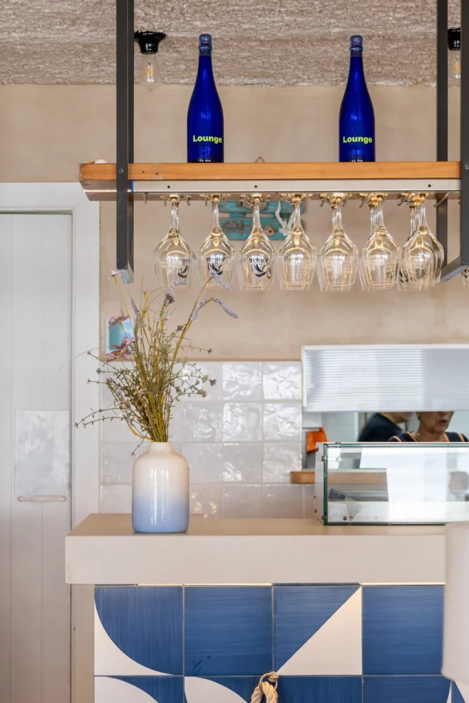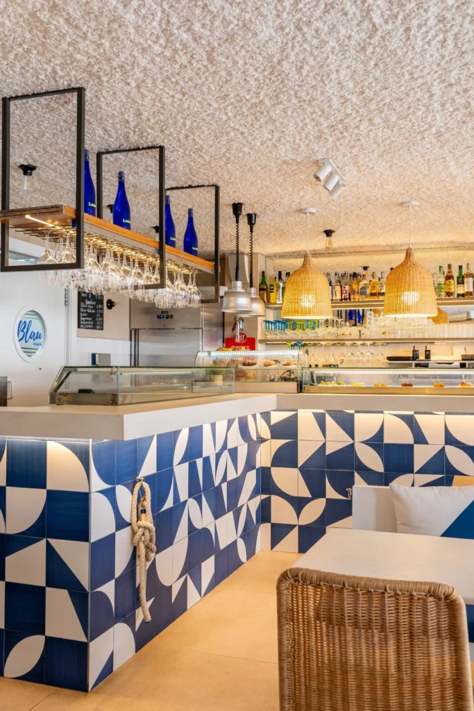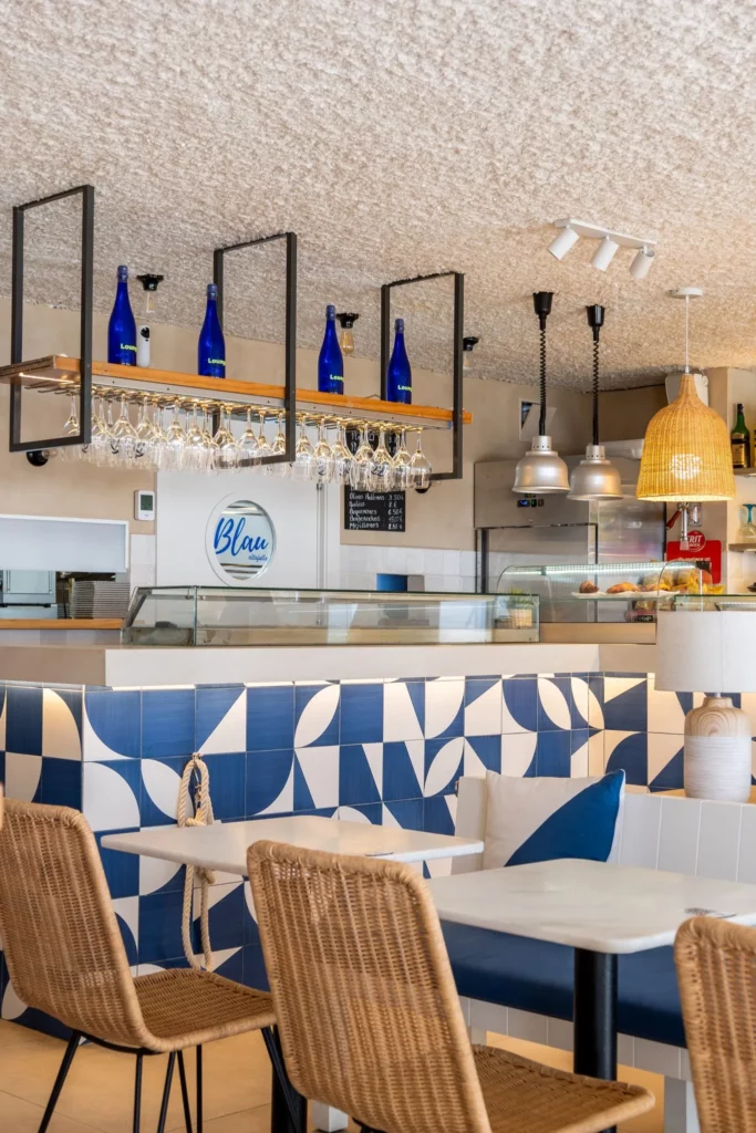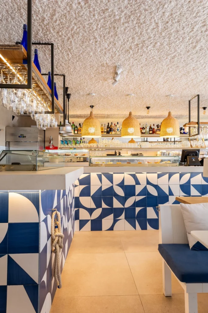 Pour évoquer l’ambiance estivale, des carreaux bleus et blancs aux formes géométriques ont été utilisés, rappelant les ombres du soleil en été. Étant donné la faible hauteur du local, un matériau acoustique a été projeté au plafond, apportant également une texture agréable.