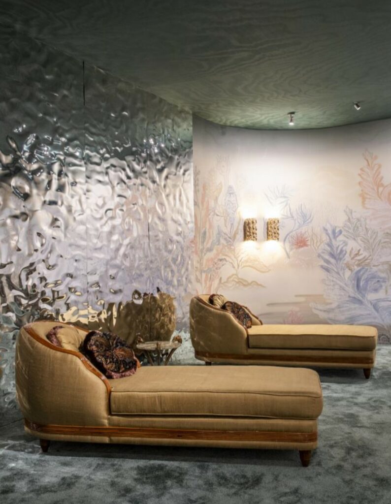 Les matériaux expriment un futurisme sensoriel qui habille les intérieurs de rugosités minérales, les investit de constellations d’objets satellites.