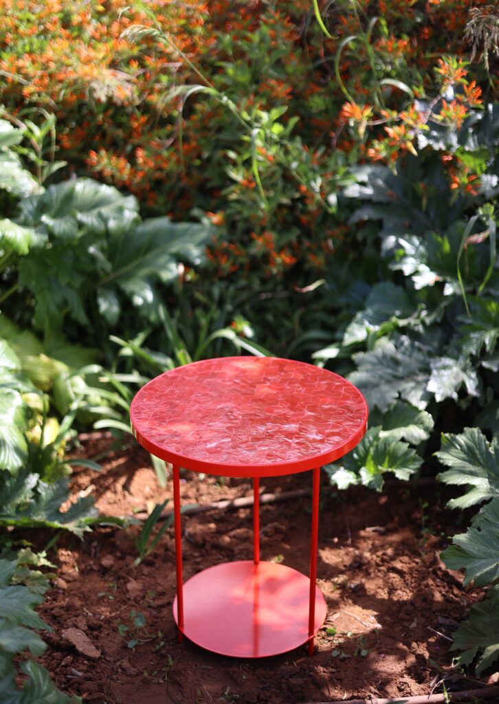 Piètement rouge flamboyant, plateau origami rouge-blanc