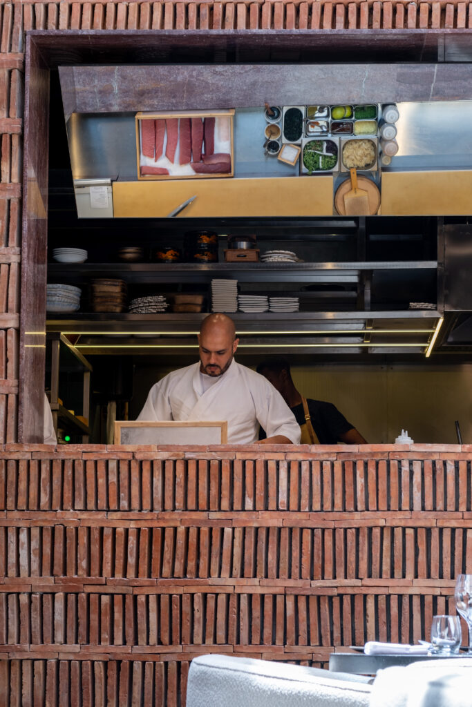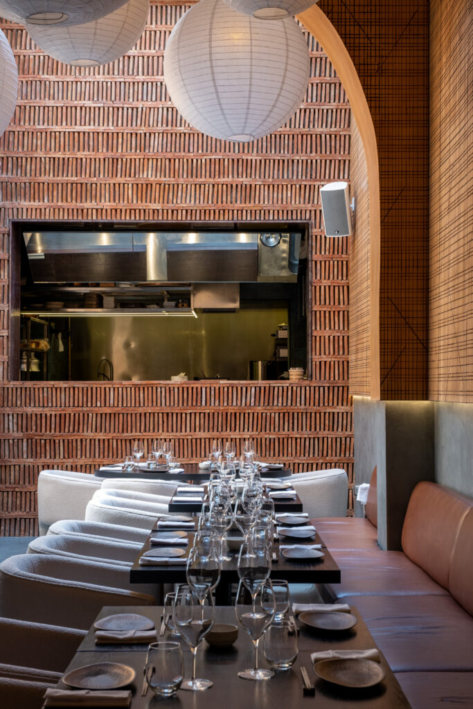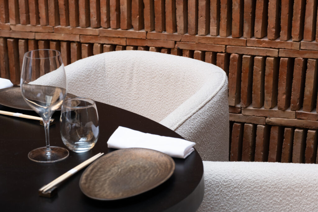 Enfin, le cuir, symbole d’élégance et de raffinement, évoque la noblesse du poisson, clé de voûte de l’art culinaire japonais. Utilisé avec parcimonie, il confère aux sièges et aux détails décoratifs une touche de luxe discret, tout en renforçant la dimension précieuse de l’expérience, enveloppant les convives dans une atmosphère à la fois sophistiquée et intime.