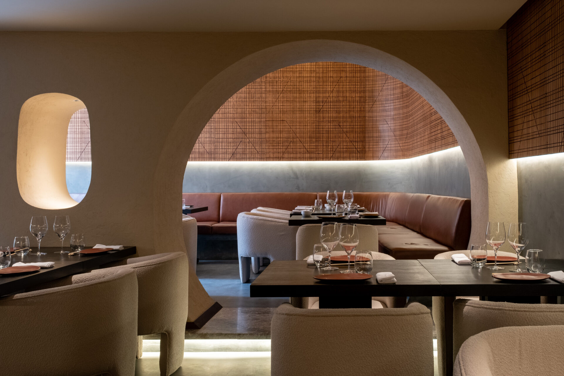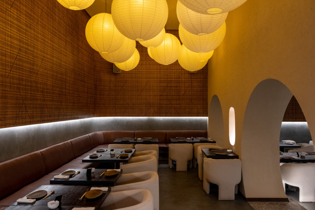 Afin de contrebalancer la rigueur des matériaux, des arcades gracieuses et des ouvertures organiques ont été introduites, infusant l’espace d’une fluidité presque onirique. Ces formes arrondies, inspirées par les courbes naturelles, créent un contraste saisissant avec la rectitude des surfaces, adoucissant l’ensemble et guidant le regard avec une élégance subtile. L’éclairage, quant à lui est minutieusement exécuté, jouant ainsi un rôle central dans la création d’une atmosphère enveloppante. De grandes lampes en papier suspendues, fidèles à la tradition japonaise, diffusent une lumière tamisée, baignant l’espace d’une lueur douce et diffuse. Cette lumière, loin d’être éblouissante, invite à la réflexion et à l’intimité, créant un cocon de tranquillité où le temps semble suspendu.