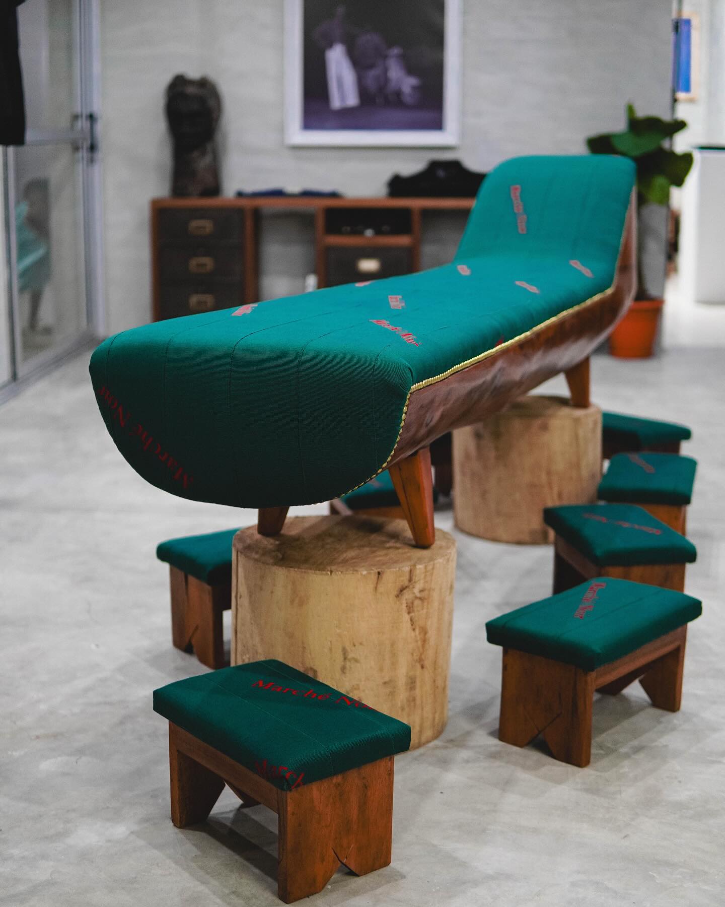 A sofa made with a recycled canoe and a hand woven kente fabric