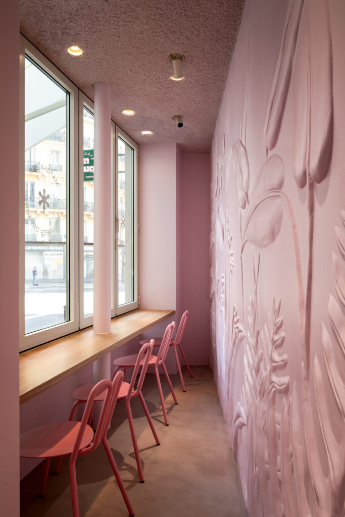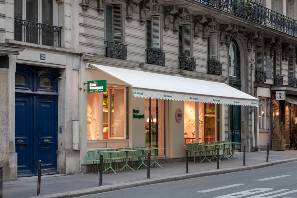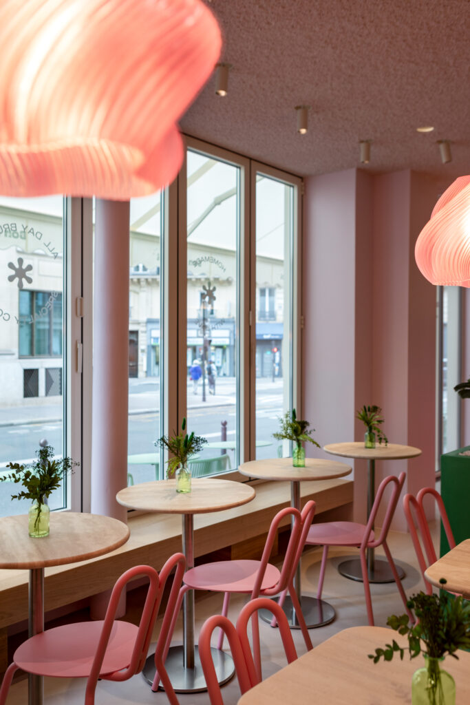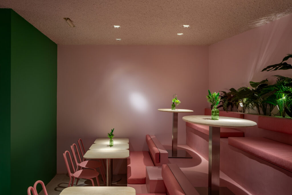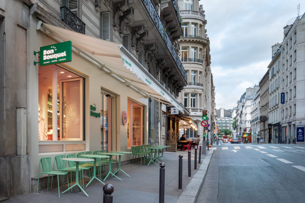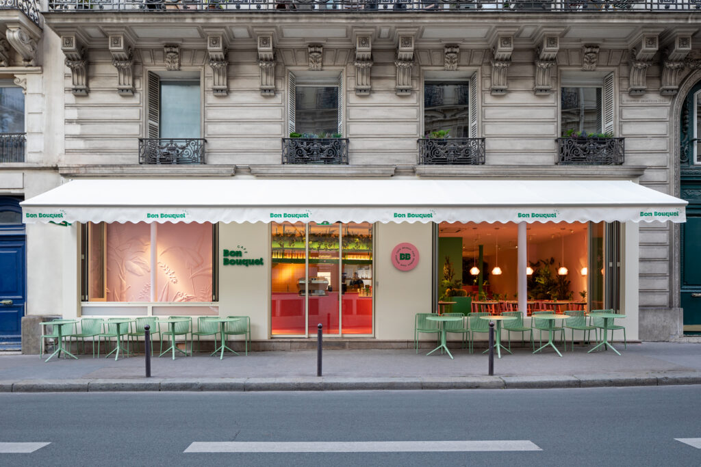 Le design de Bon Bouquet défie l’esthétique parisienne traditionnelle. Fini les meubles en osier et les lampes classiques ; à la place, le café présente des éléments modernes élégants qui font sensation. De l’extérieur, Bon Bouquet apparaît relativement calme : une façade laiteuse avec une signalétique de nom et de logo discrète, et un système de fenêtres vitrées enroulables. Cependant, une fois à l’intérieur, les clients sont enveloppés dans un rose luxuriant et des designs audacieux.