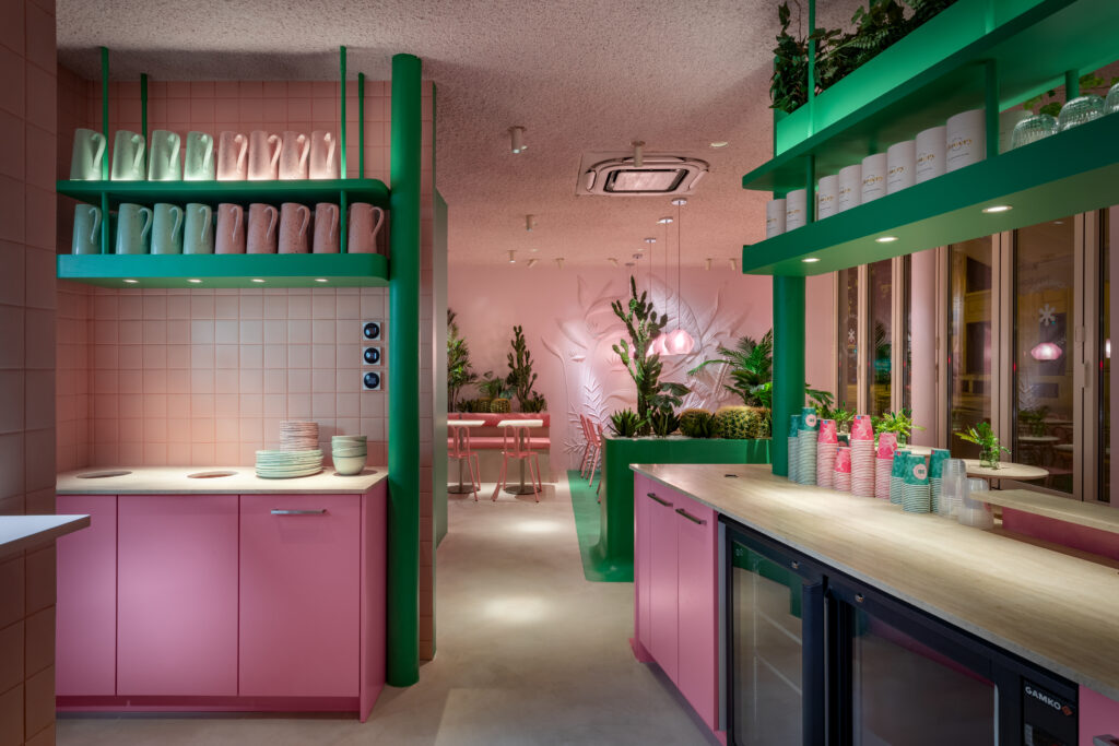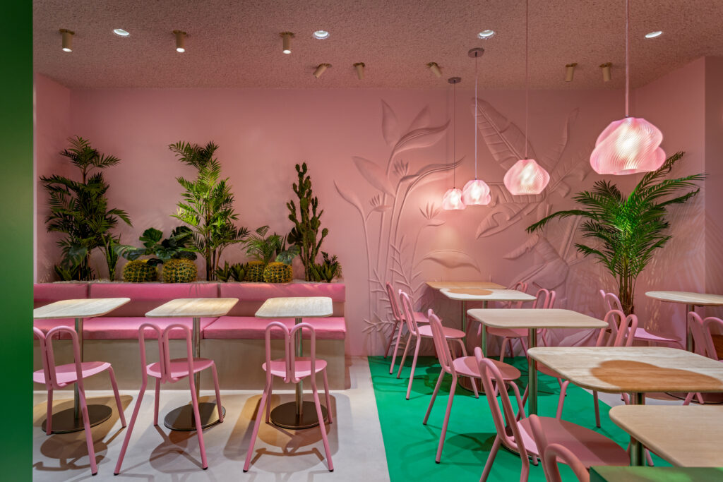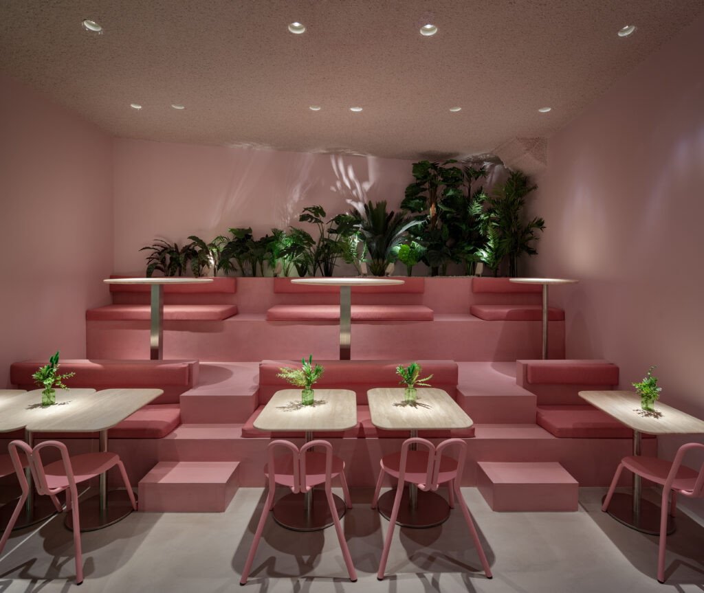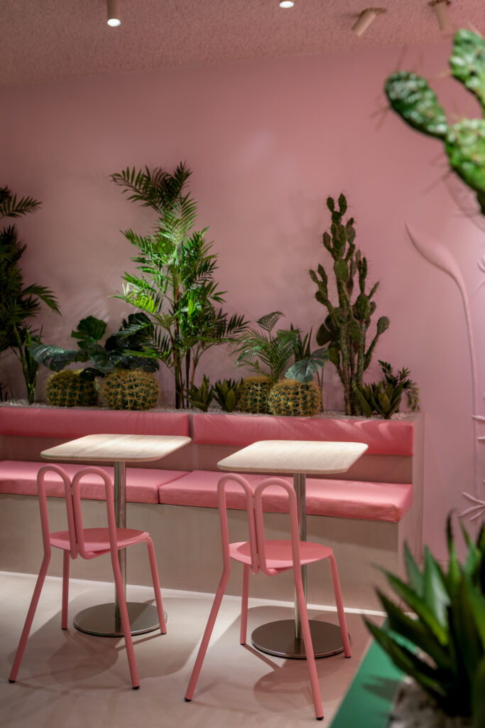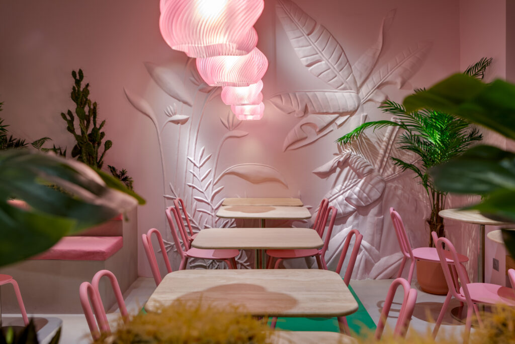 L’une des caractéristiques notables est l’utilisation extensive de microciment pour le sol, les banquettes, les tiroirs et le comptoir du bar. Ce matériau durable offre non seulement praticité et facilité d’entretien, mais crée également une texture naturelle qui complète l’environnement verdoyant du café. De la mousse acoustique a été utilisée pour finir le plafond, isolant l’établissement des appartements résidentiels des étages supérieurs. L’espace est conçu pour encourager l’exploration. Des scénarios bien pensés pour l’agencement du mobilier et du décor motivent les visiteurs à interagir avec leur environnement. Les tables et chaises rose vif contrastent magnifiquement avec la végétation luxuriante qui orne le café, créant une atmosphère dynamique.