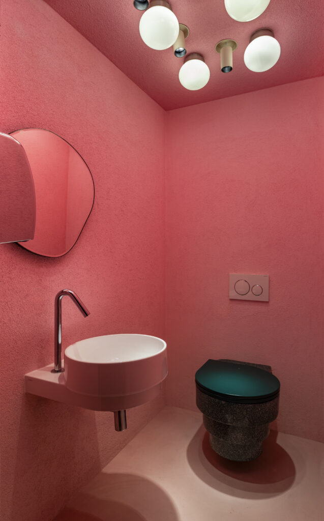 Les toilettes poursuivent le récit audacieux du design de Bon Bouquet avec deux schémas de couleurs différents qui soulignent l’esthétique unique de l’espace. La salle de bain verte est ornée de murs richement texturés qui créent une atmosphère apaisante mais vibrante. L’utilisation de formes organiques est évidente dans le design ondulant du miroir, qui ajoute une touche ludique à l’espace minimaliste.