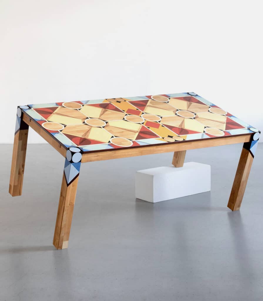 Créateur de mode et peintre, Alexandre Blanc a choisi une table en chêne pour y apposer un imprimé pictural unique. Entre motifs baroques et inspirations de la villa Farnèse, son travail de peinture en trompe-l’œil sublime l’objet. “L’ornement est noble, il raconte une histoire”, affirme-t-il.