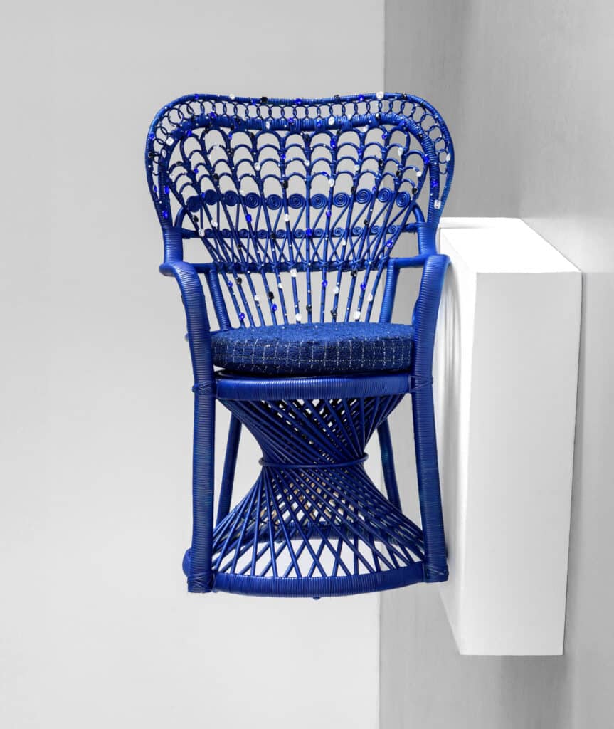 Spécialiste du tissage à partir de matériaux upcyclés, Benjamin Benmoyal a métamorphosé un fauteuil en rotin. Peint en bleu nuit et parsemé de cristaux, il évoque un ciel étoilé. Son assise en tweed scintillant, conçue à partir de fils de deadstocks et de sequins, prolonge son univers textile. “C’est comme le 51e look de ma collection”, confie-t-il.