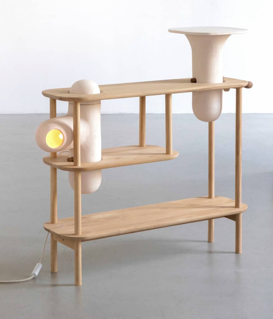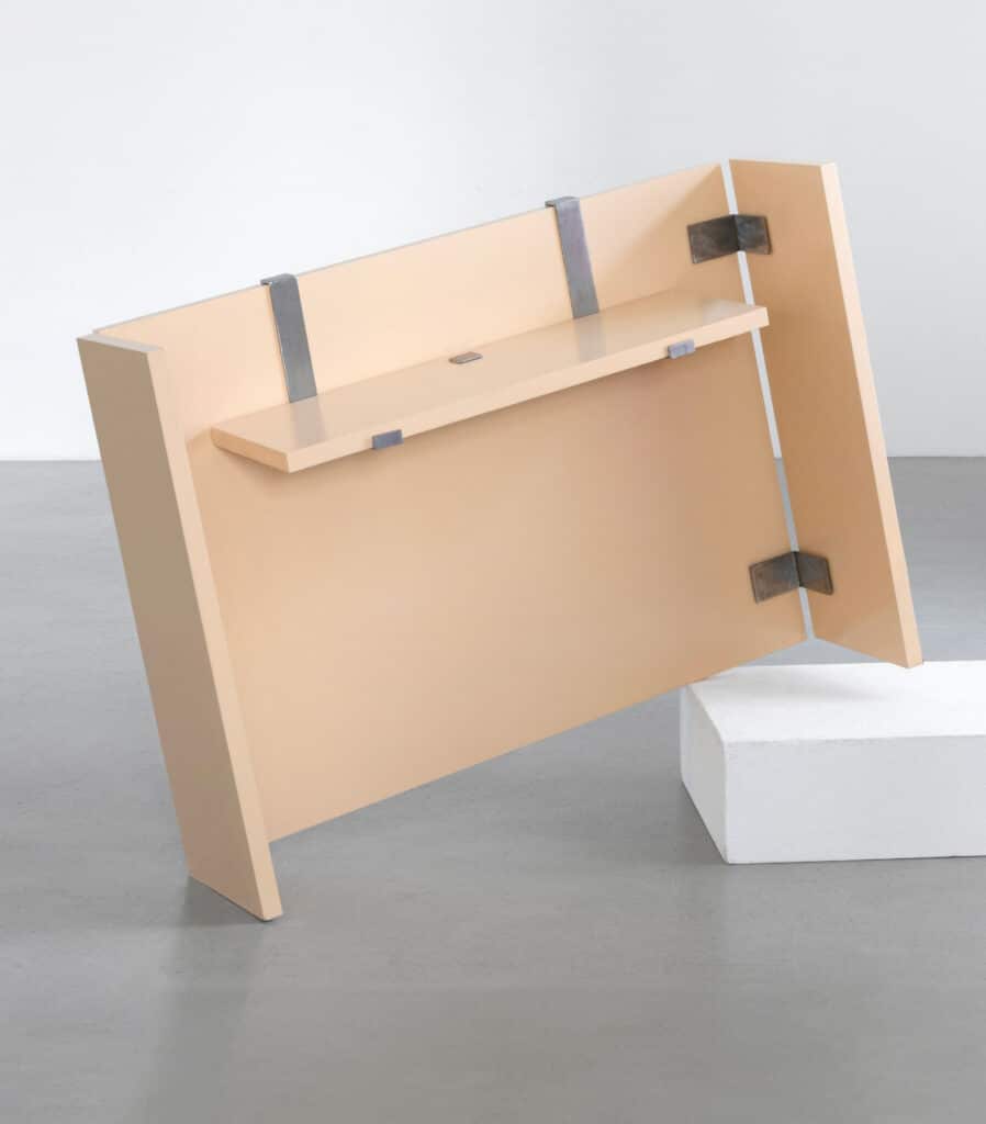 Architecte d’intérieur, Mathieu Tran Nguyen a réinventé une étagère métallique en console épurée. Le métal recyclé devient charnières décoratives, sublimées par des panneaux en bois laqué. “Je voulais montrer que les matériaux simples peuvent être magnifiés”, souligne-t-il.