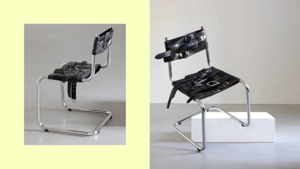 Avec ses créations upcyclées et son militantisme, Jeanne Friot transforme deux chaises en icônes mode en les sanglant de ceintures en cuir chinées. Pour elle, “l’accessoire est un symbole d’empowerment”, et ce projet prolonge son engagement féministe et écologique.