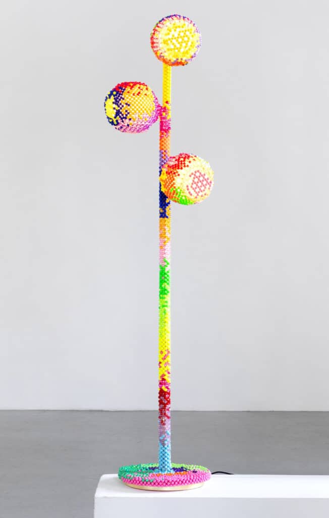 Connu pour ses créations flamboyantes et écoresponsables, Kevin Germanier a transformé un luminaire en véritable bijou. Trois mois de travail ont été nécessaires pour le broder intégralement de perles multicolores upcyclées. “Cette pièce illustre l’ADN de ma marque”, dit-il.