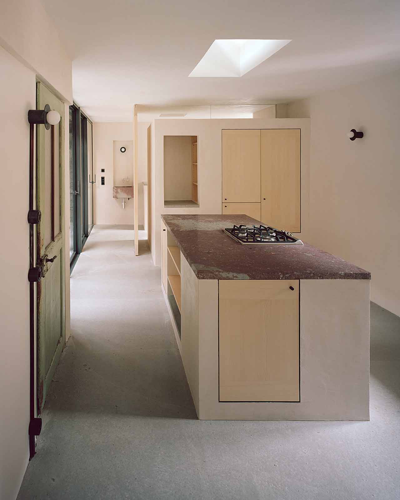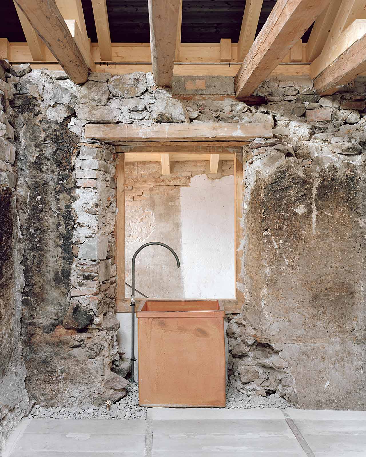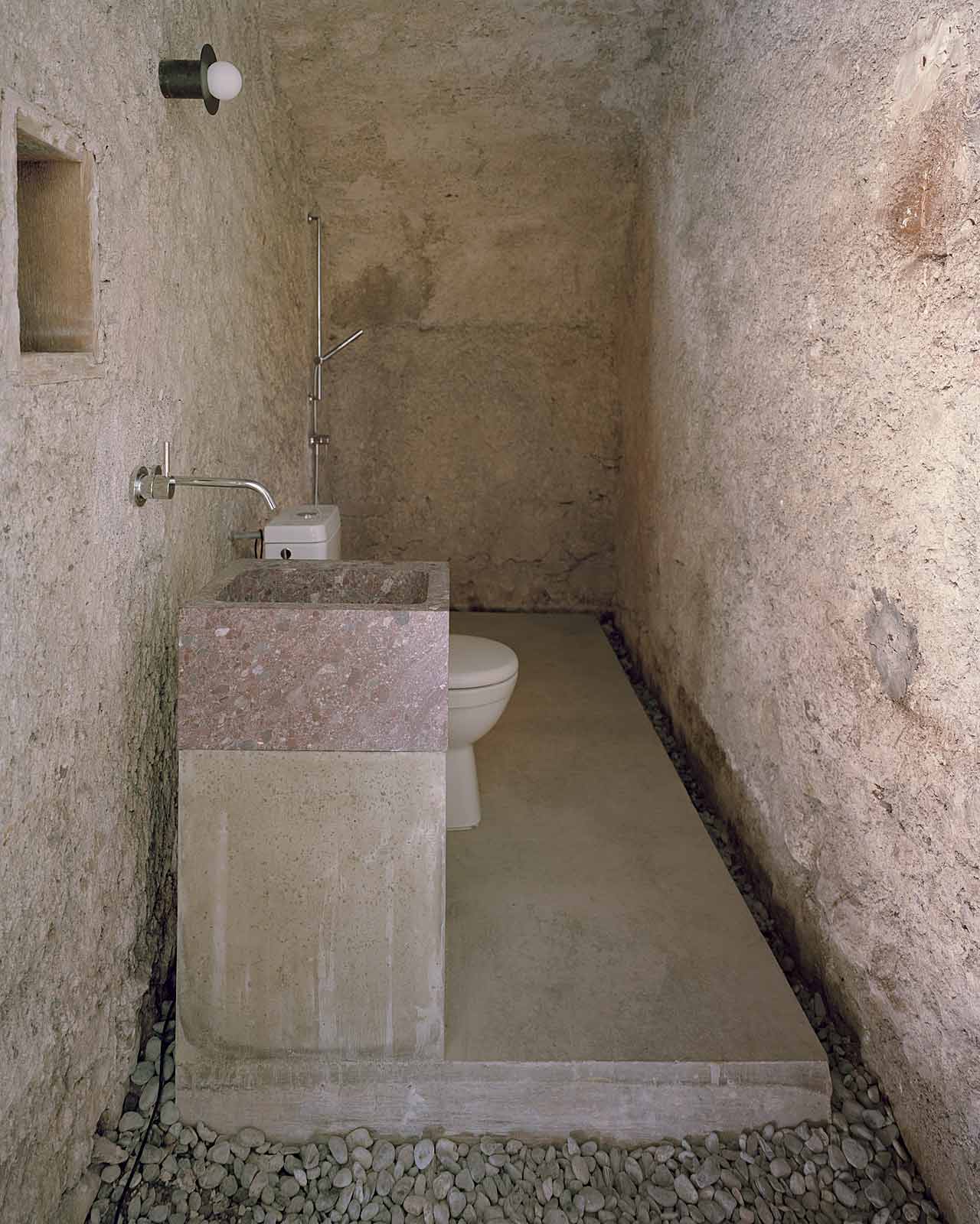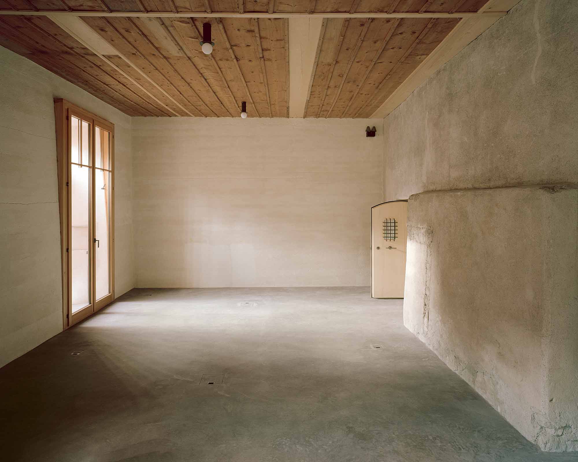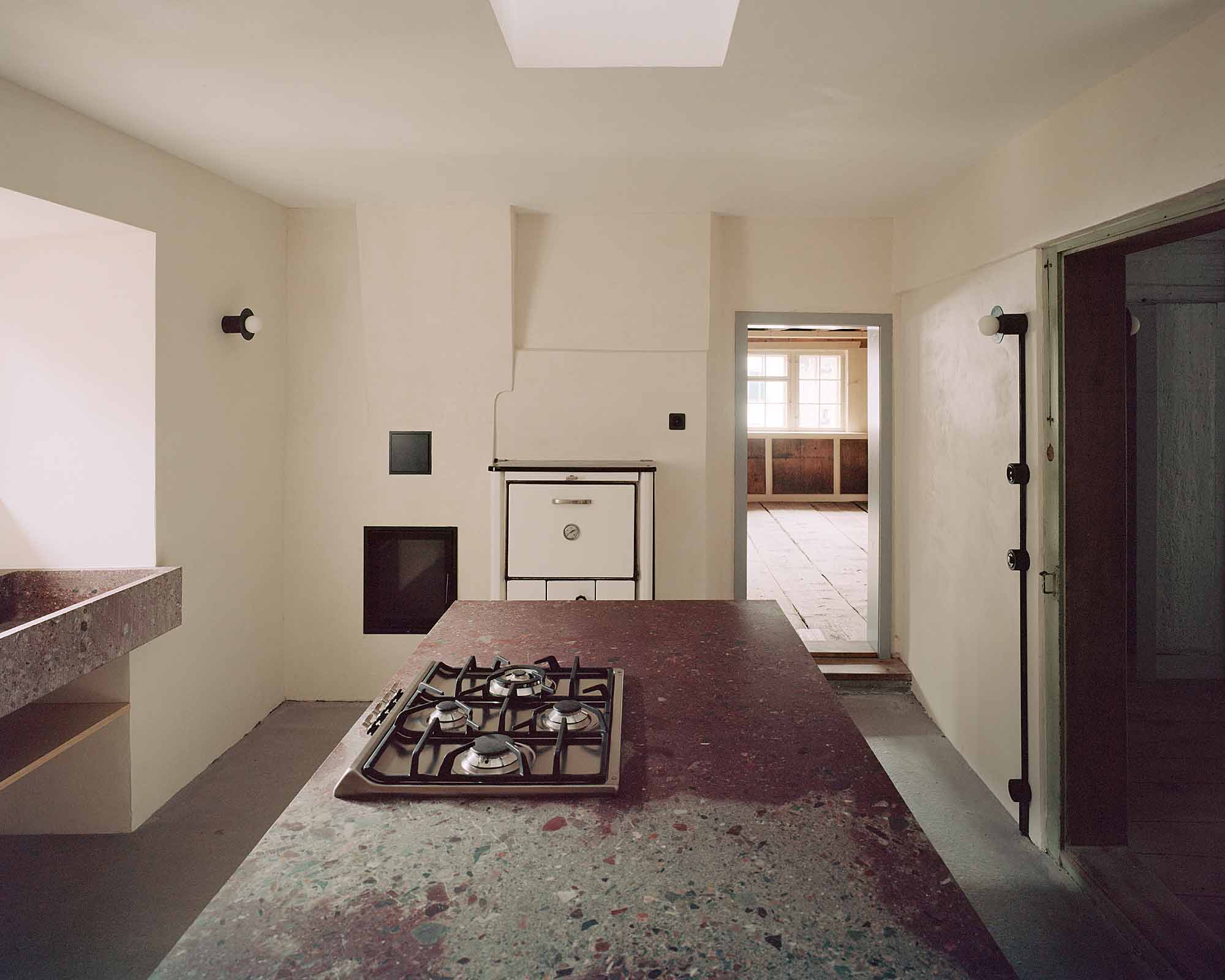En retirant les couches de modifications ultérieures, les architectes ont découvert la clarté spatiale d’origine de la maison : les pièces étaient généreuses mais néanmoins réduites à l’essentiel, autrefois divisées en chambres à coucher étroites. Le langage des matériaux a été choisi en tenant compte de la spécificité du site, en privilégiant la pierre, la chaux et le bois locaux, renforçant le lien du bâtiment avec son paysage. Les cuisines et les salles de bains n’ont pas été ajoutées comme des interventions étrangères mais intégrées à la structure elle-même, leurs surfaces en plâtre brut se fondant dans le tissu existant.