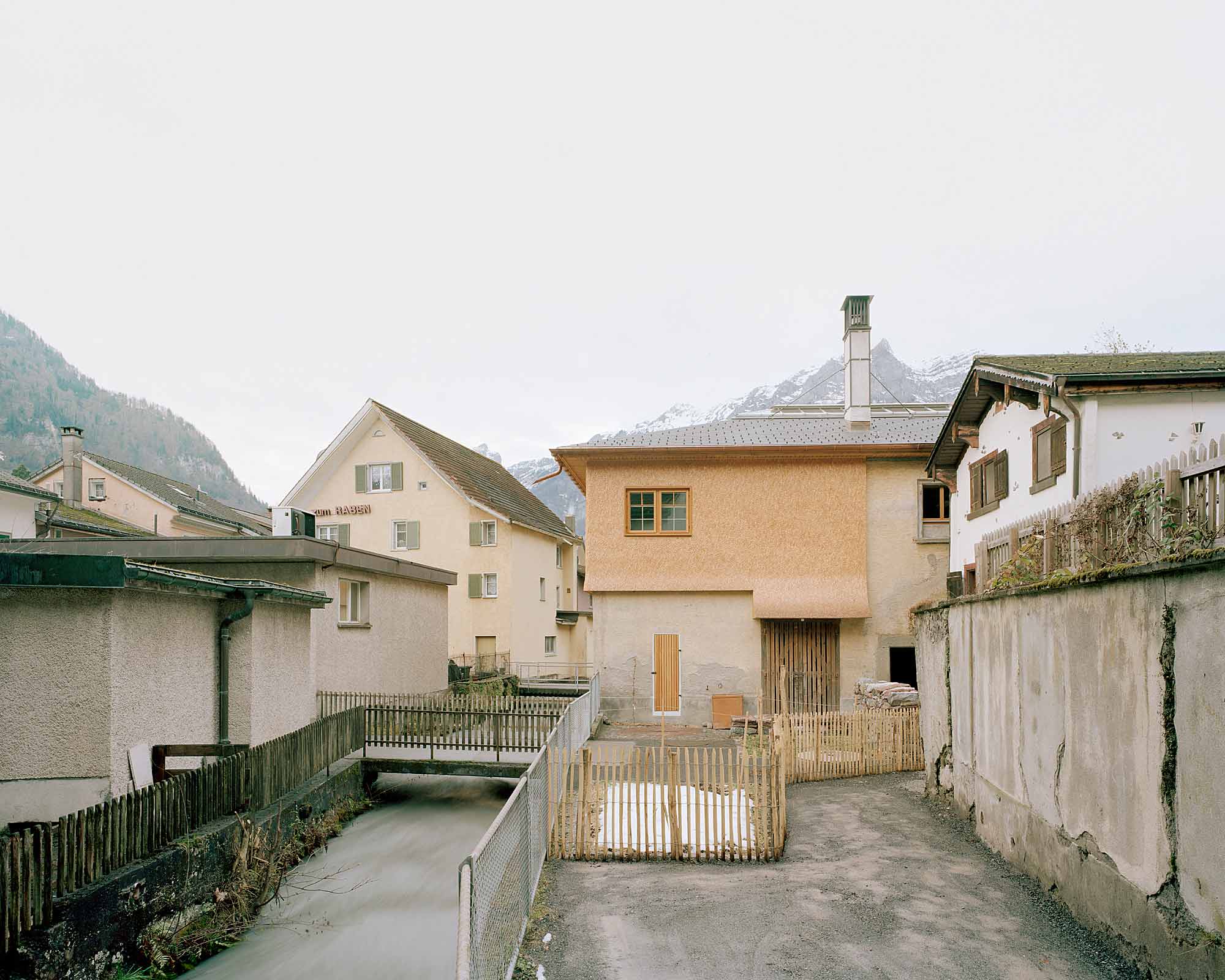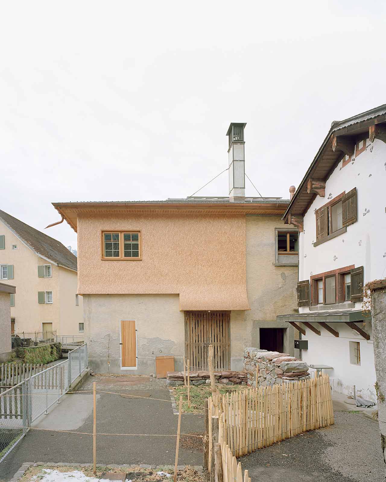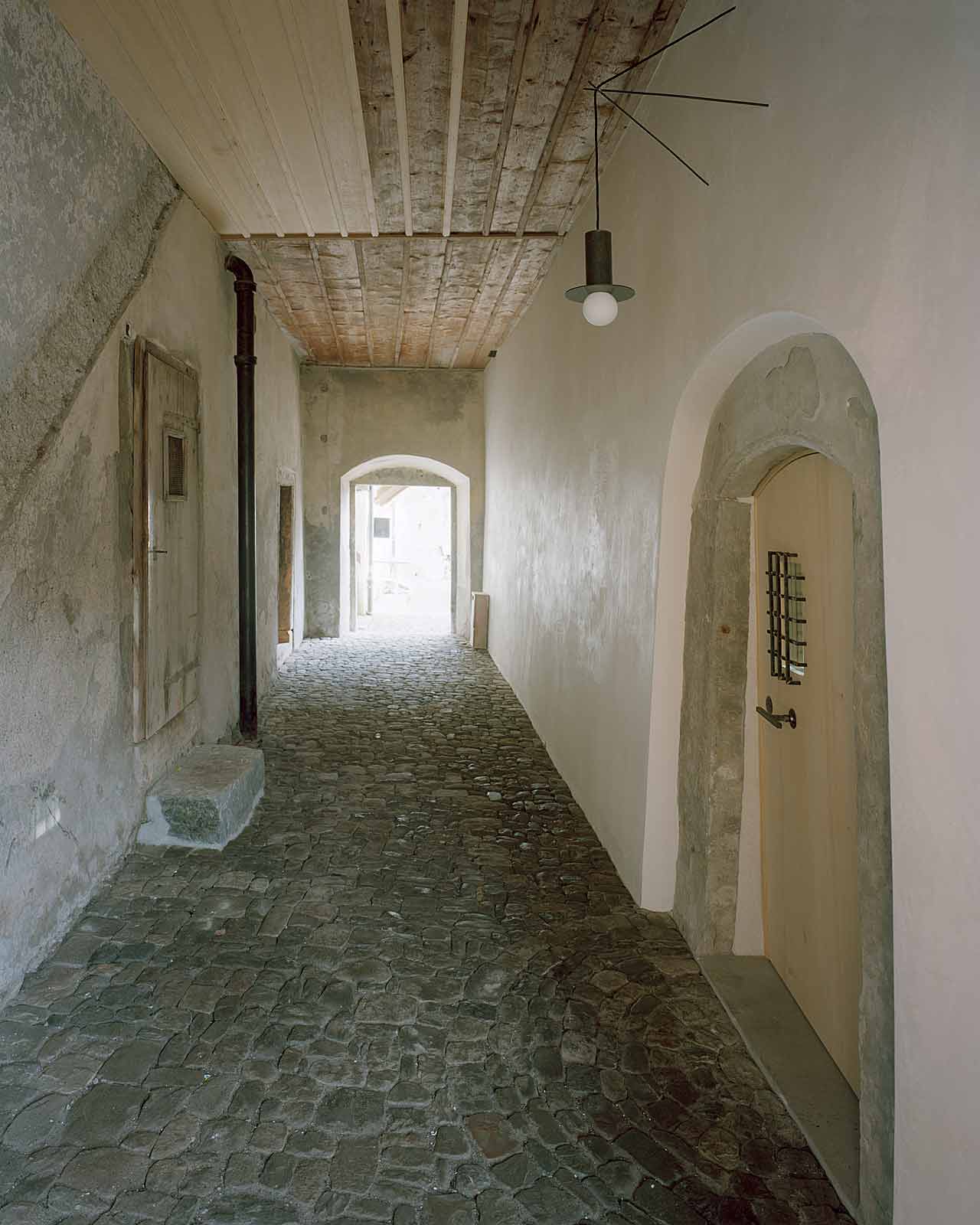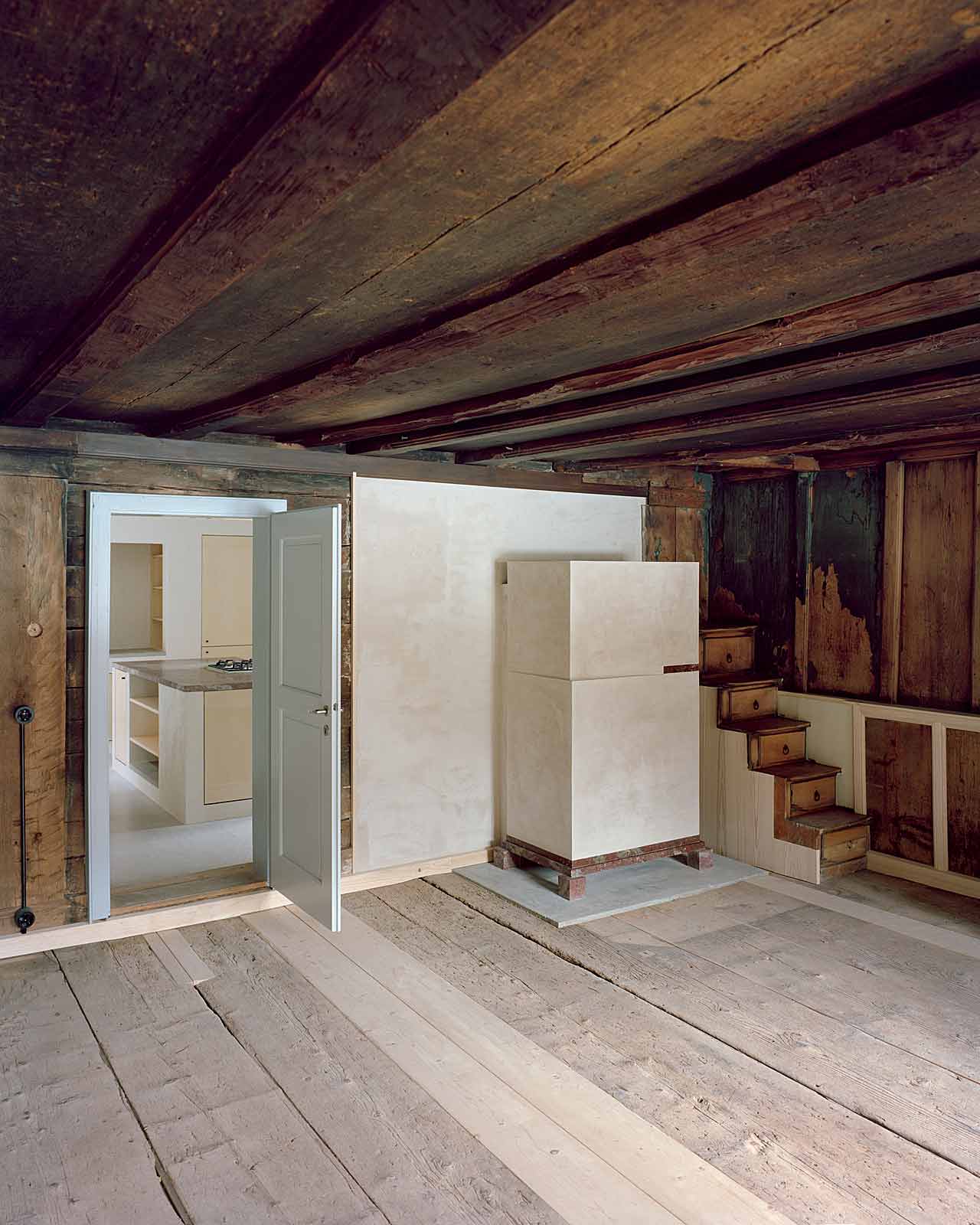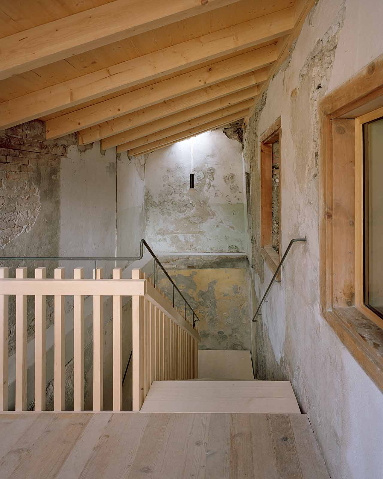 En retirant les couches de modifications ultérieures, les architectes ont découvert la clarté spatiale d’origine de la maison : les pièces étaient généreuses mais néanmoins réduites à l’essentiel, autrefois divisées en chambres à coucher étroites. Le langage des matériaux a été choisi en tenant compte de la spécificité du site, en privilégiant la pierre, la chaux et le bois locaux, renforçant le lien du bâtiment avec son paysage. Les cuisines et les salles de bains n’ont pas été ajoutées comme des interventions étrangères mais intégrées à la structure elle-même, leurs surfaces en plâtre brut se fondant dans le tissu existant.