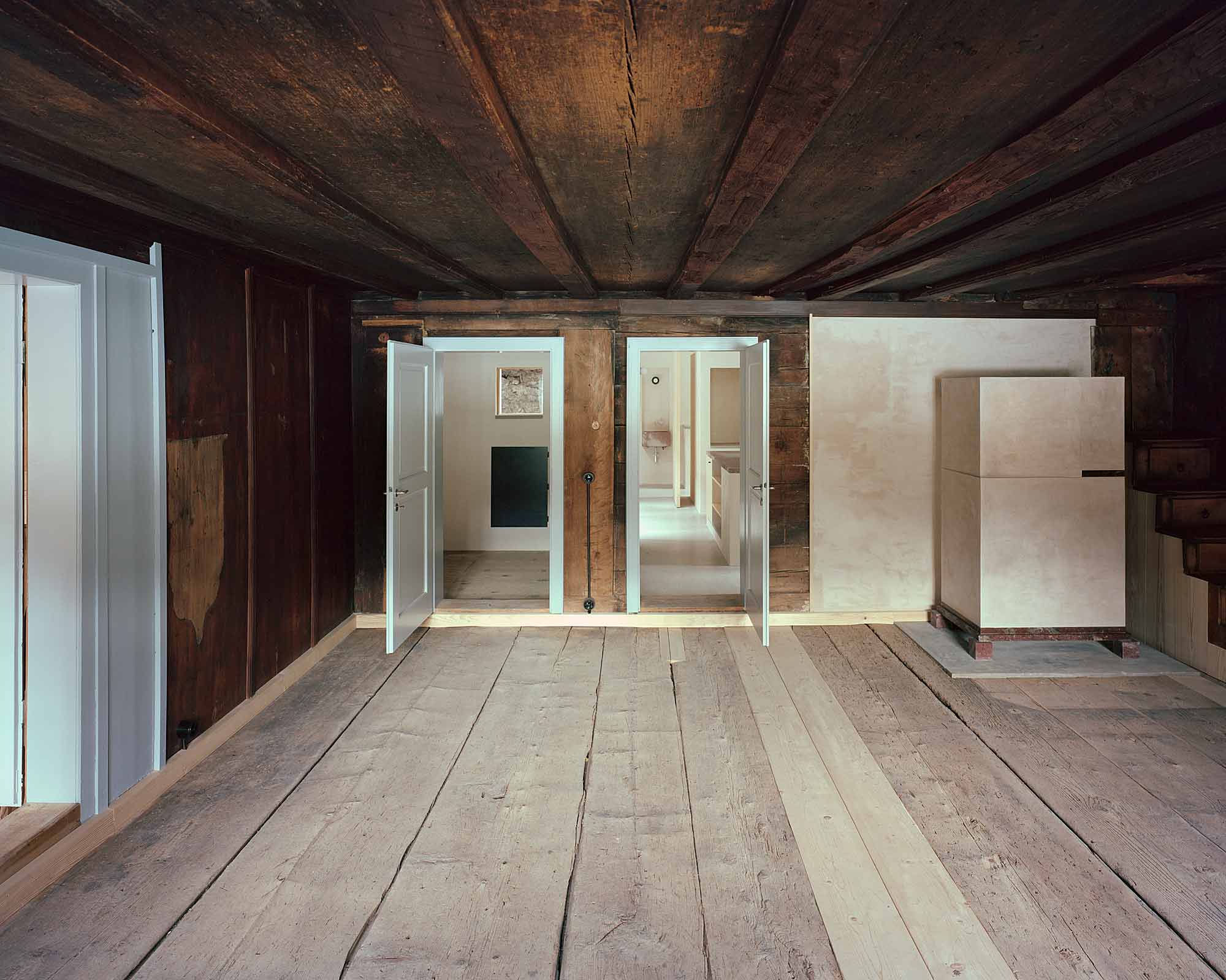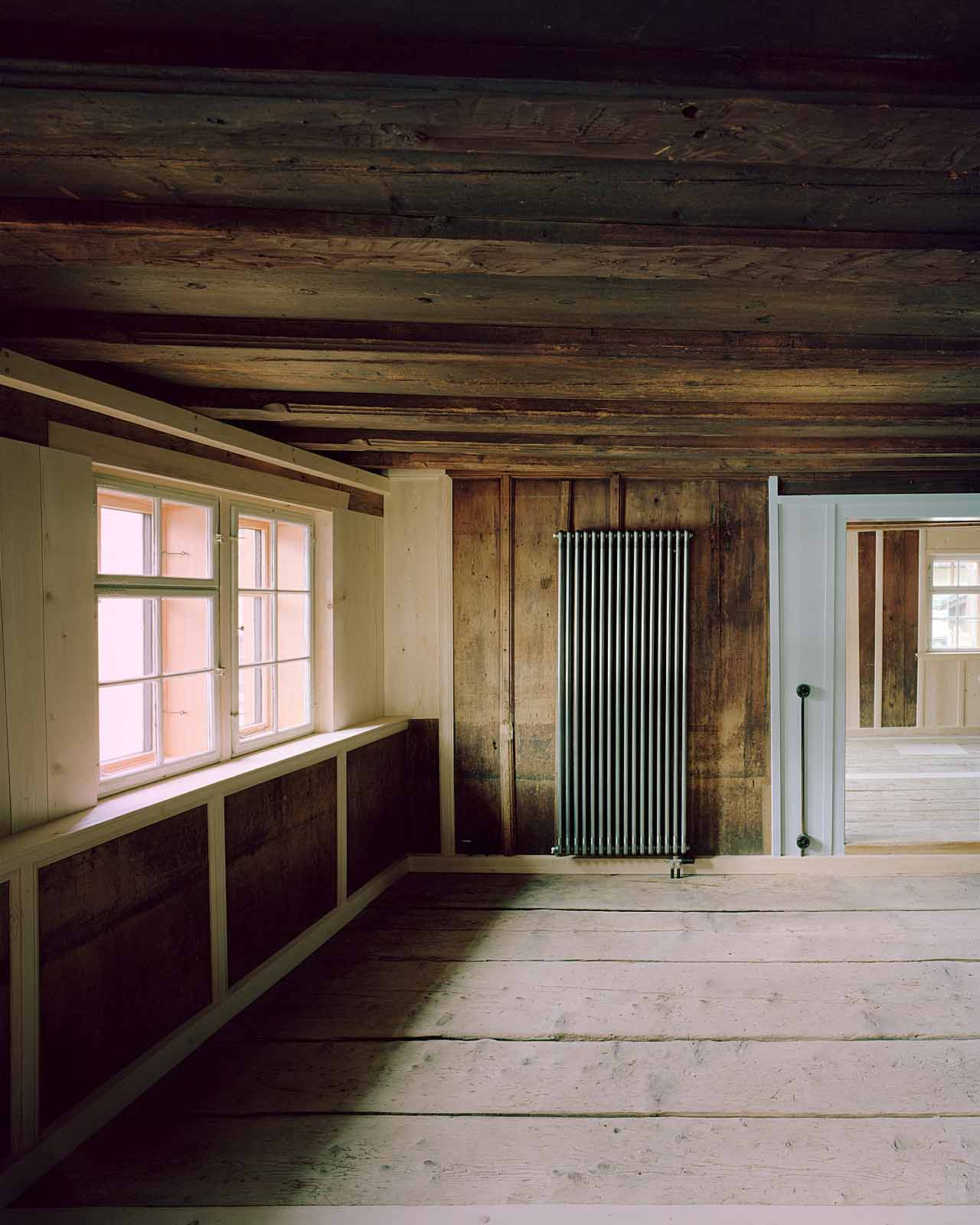 Le concept de « Leerräume » (espaces vides) a joué un rôle essentiel dans l’intervention. Au lieu de fermer les zones vulnérables à l’eau et à la pourriture, les architectes ont laissé l’humidité s’échapper à travers des murs perméables à la chaux et en chanvre, choisissant un équilibre naturel.
