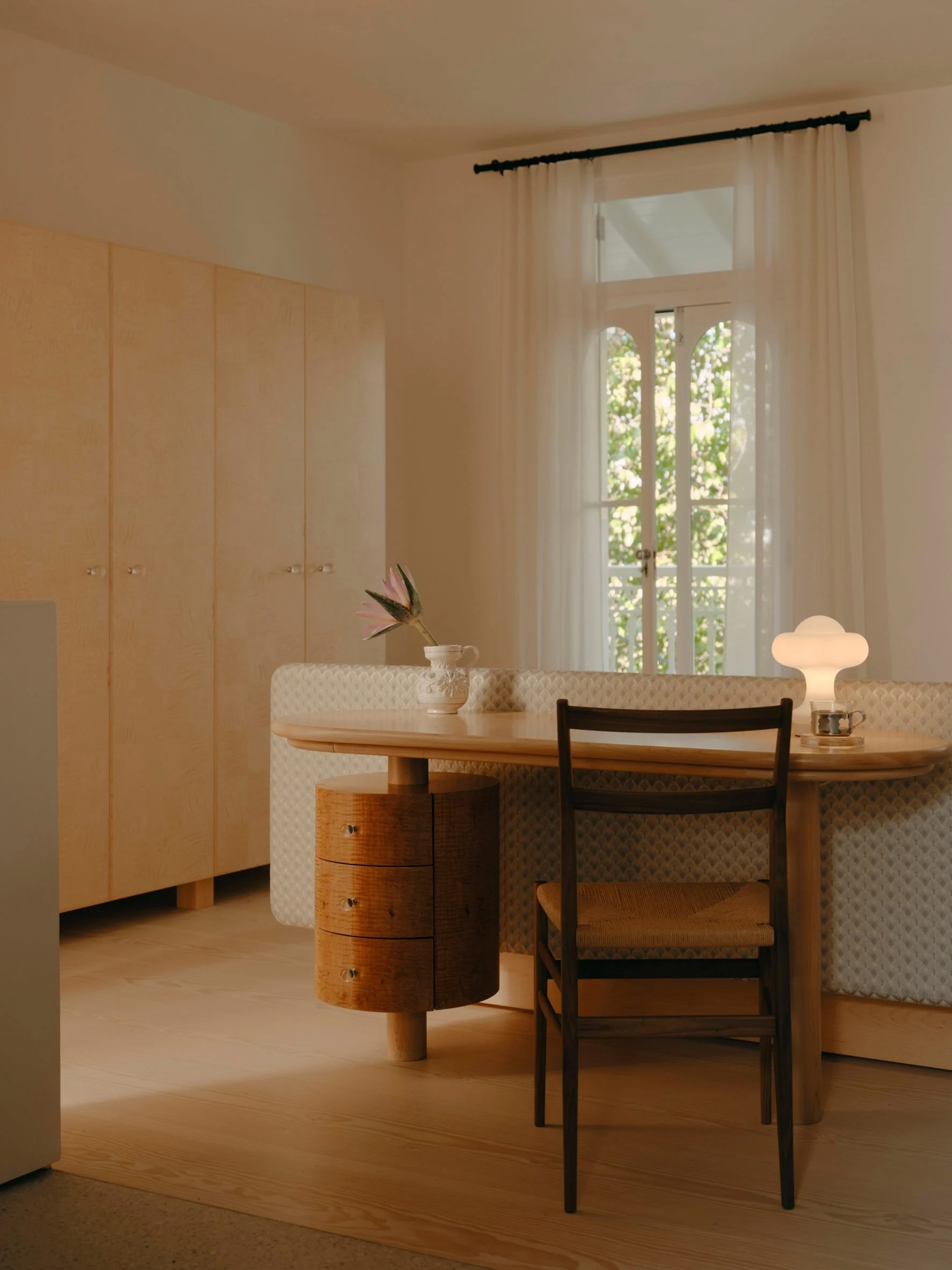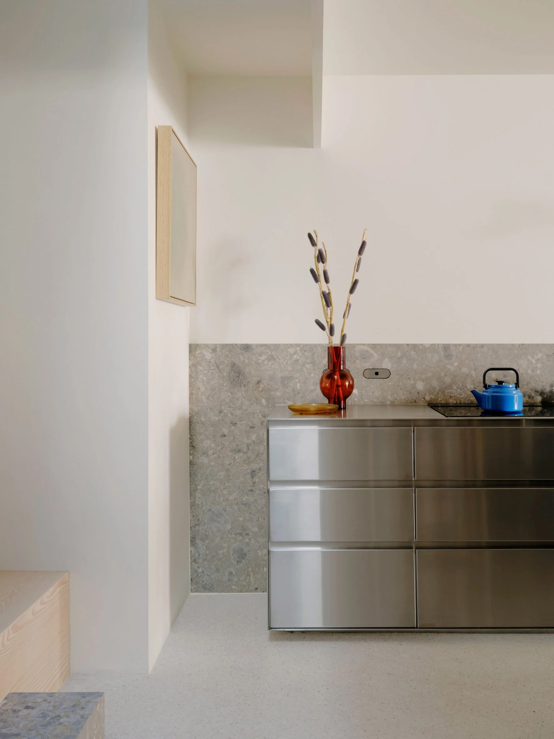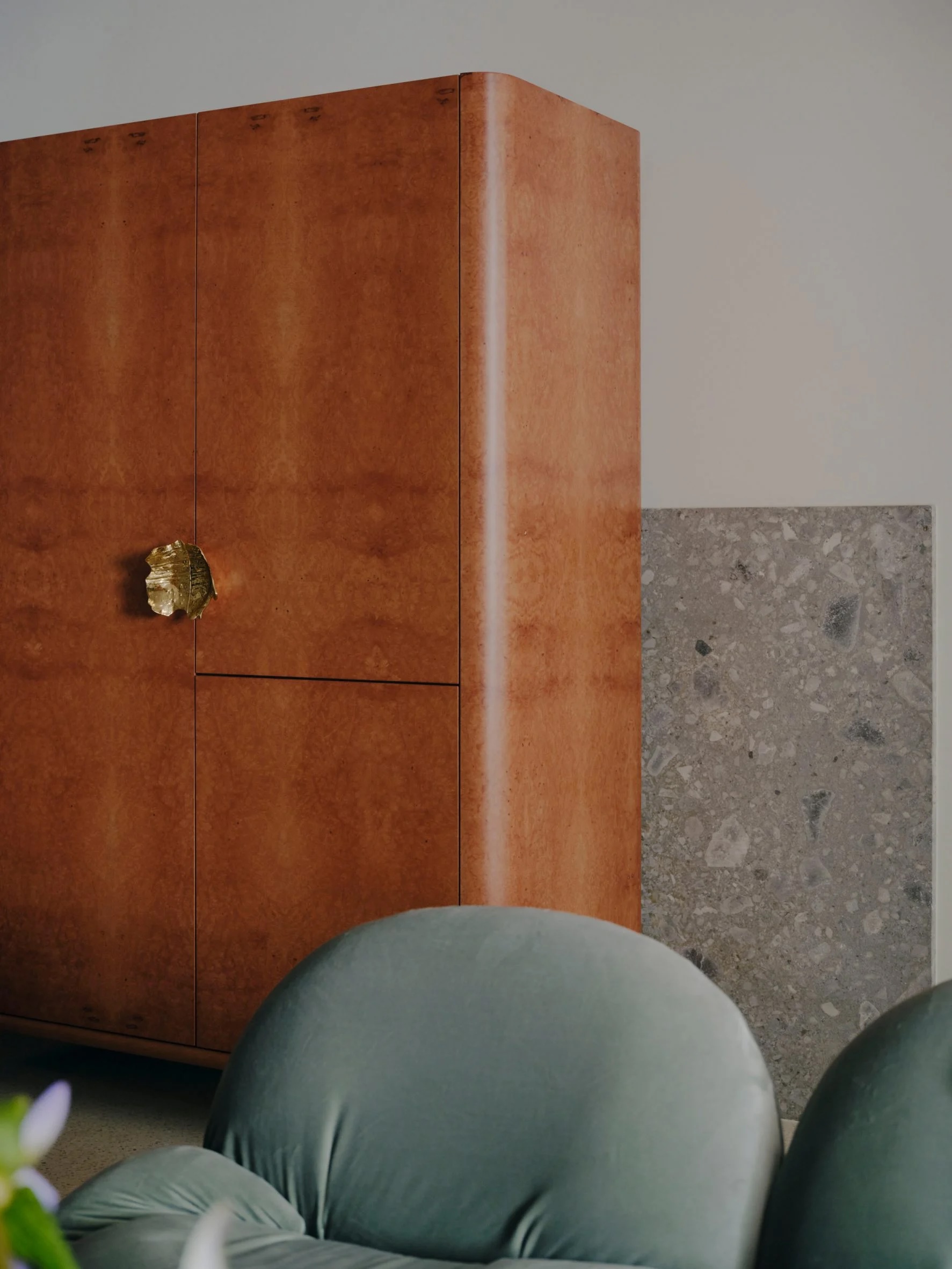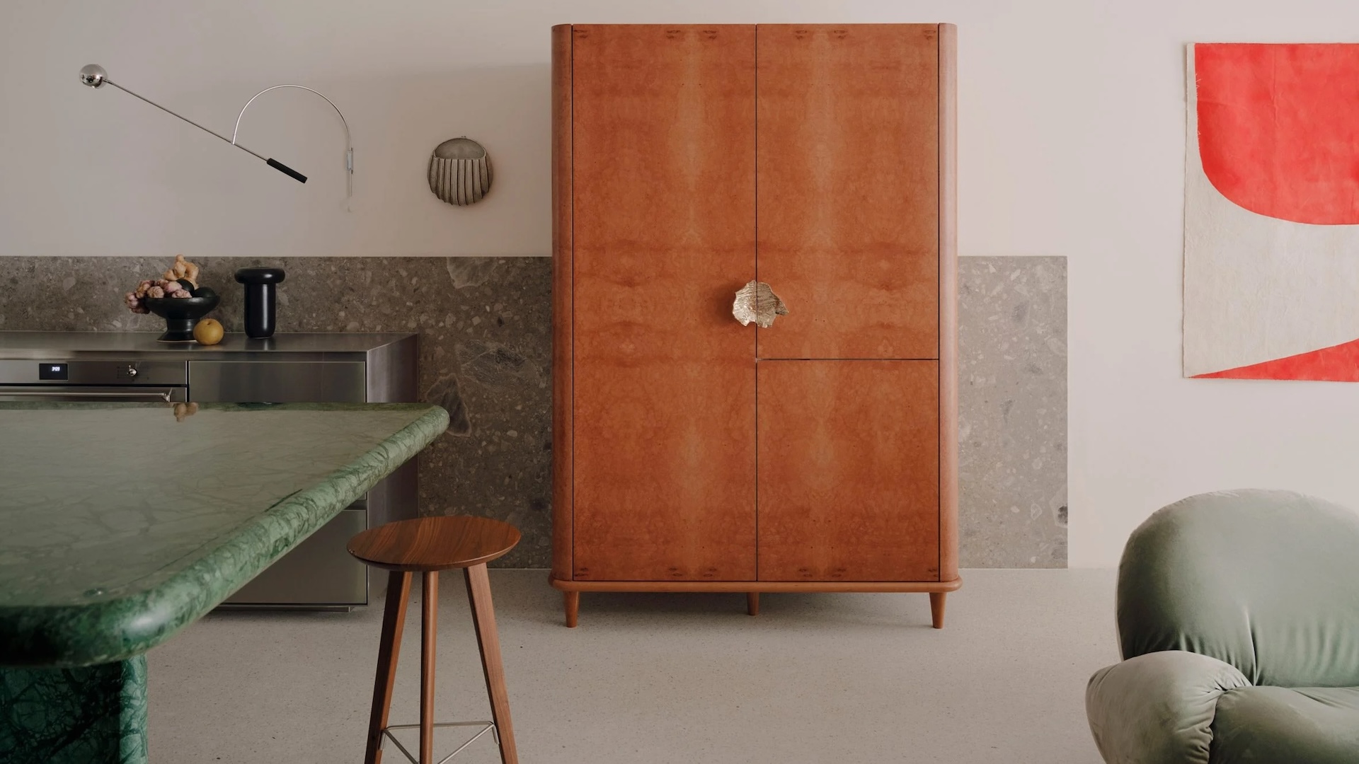 Un îlot en pierre veinée vert jade se trouve au centre de la cuisine, placé en face d’un élégant meuble en acier inoxydable qui abrite la cuisinière et des rangements supplémentaires. Le studio a conçu une armoire en loupe de cerisier sur-mesure pour dissimuler le réfrigérateur et le garde-manger, qui pourrait être confondu avec une armoire vintage. C’est l’une des nombreuses unités indépendantes de la maison, choisie comme alternative à la menuiserie intégrée traditionnelle que l’on trouve souvent dans les rénovations.