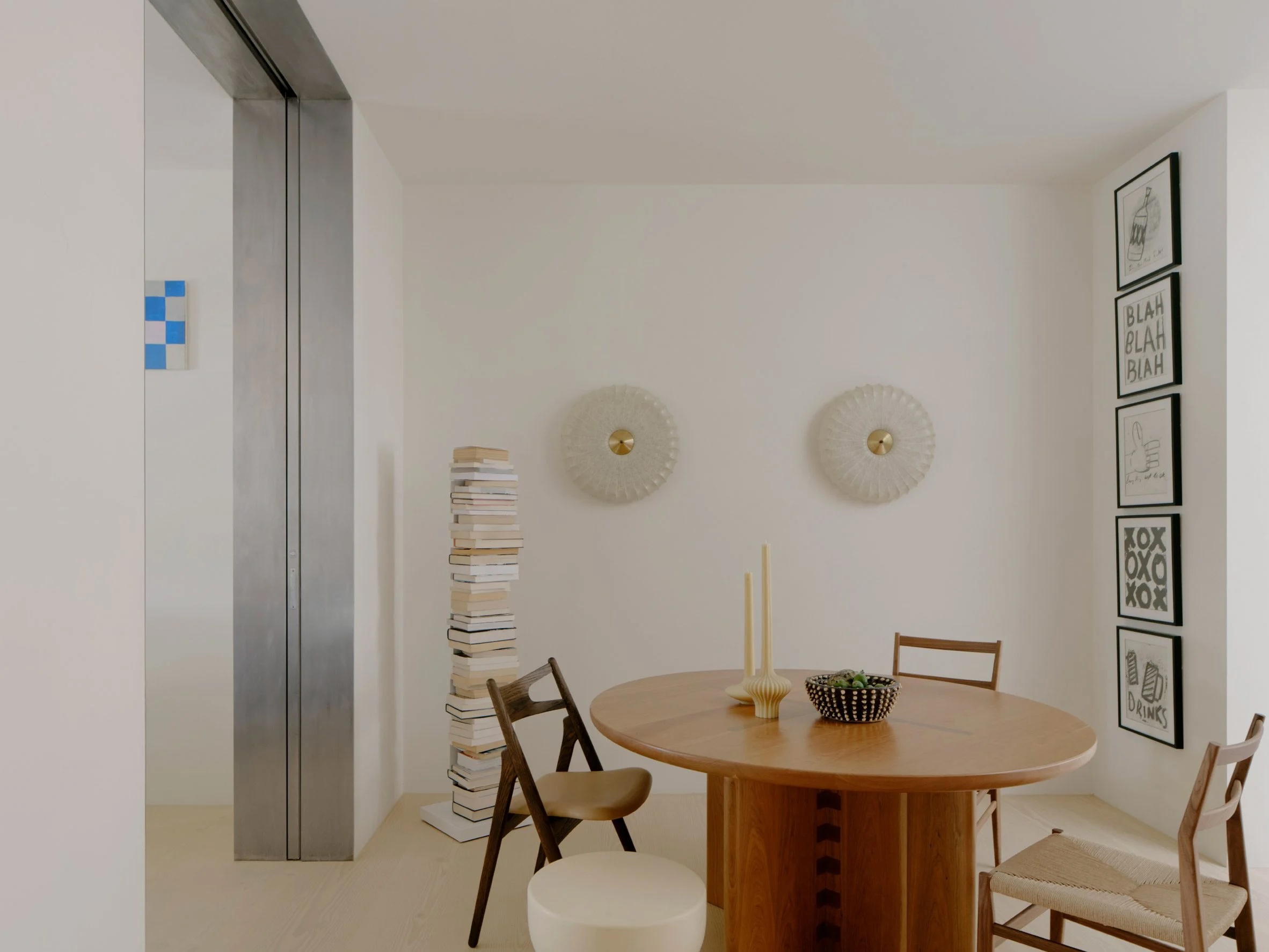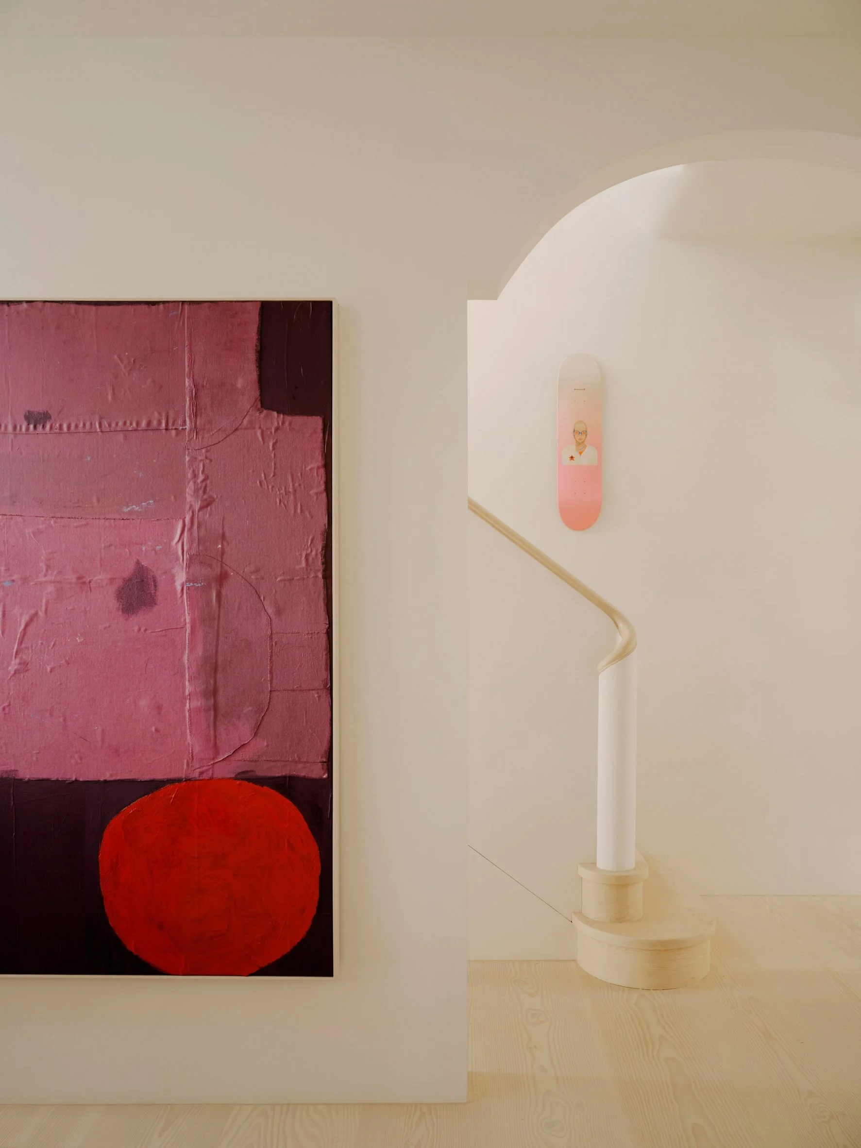 Un plâtre neutre a été choisi pour les murs, offrant une toile de fond subtile à la collection colorée de peintures, tapisseries et photographies des occupants.