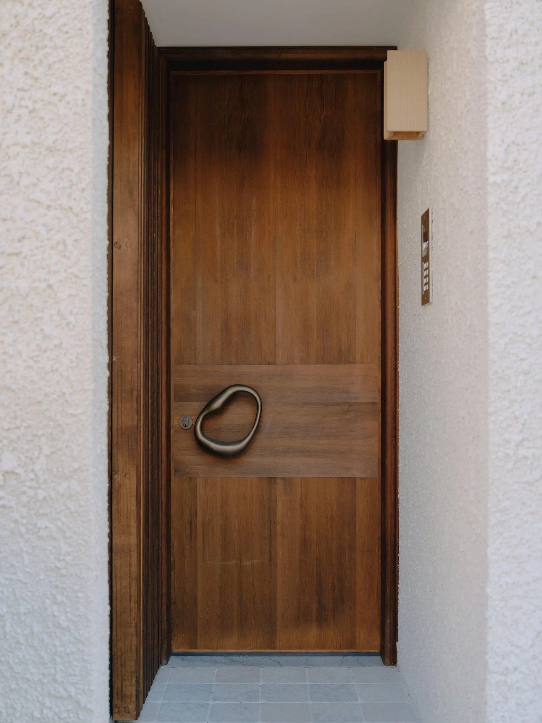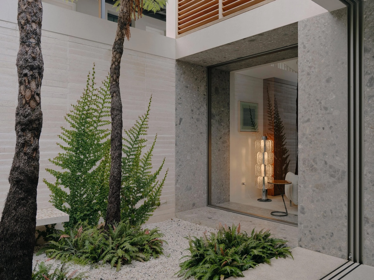 La lumière naturelle inonde cet espace, grâce à une petite cour accessible par des portes coulissantes du sol au plafond et agrémentée de plantes luxuriantes et d’un banc en terrazzo. Un tourne-disque a été caché dans une armoire en bois à lattes sur mesure, placée en face d’un bar à boissons rétroéclairé tout en pierre pour se divertir.