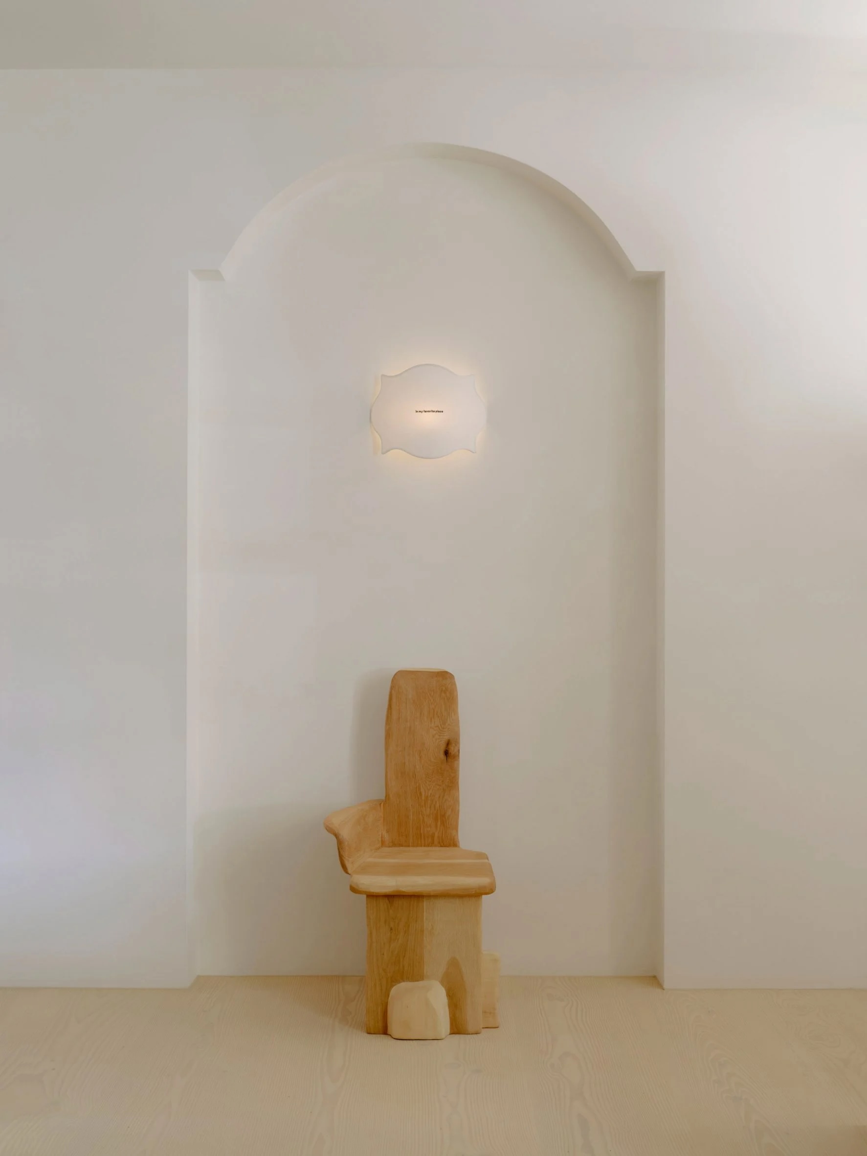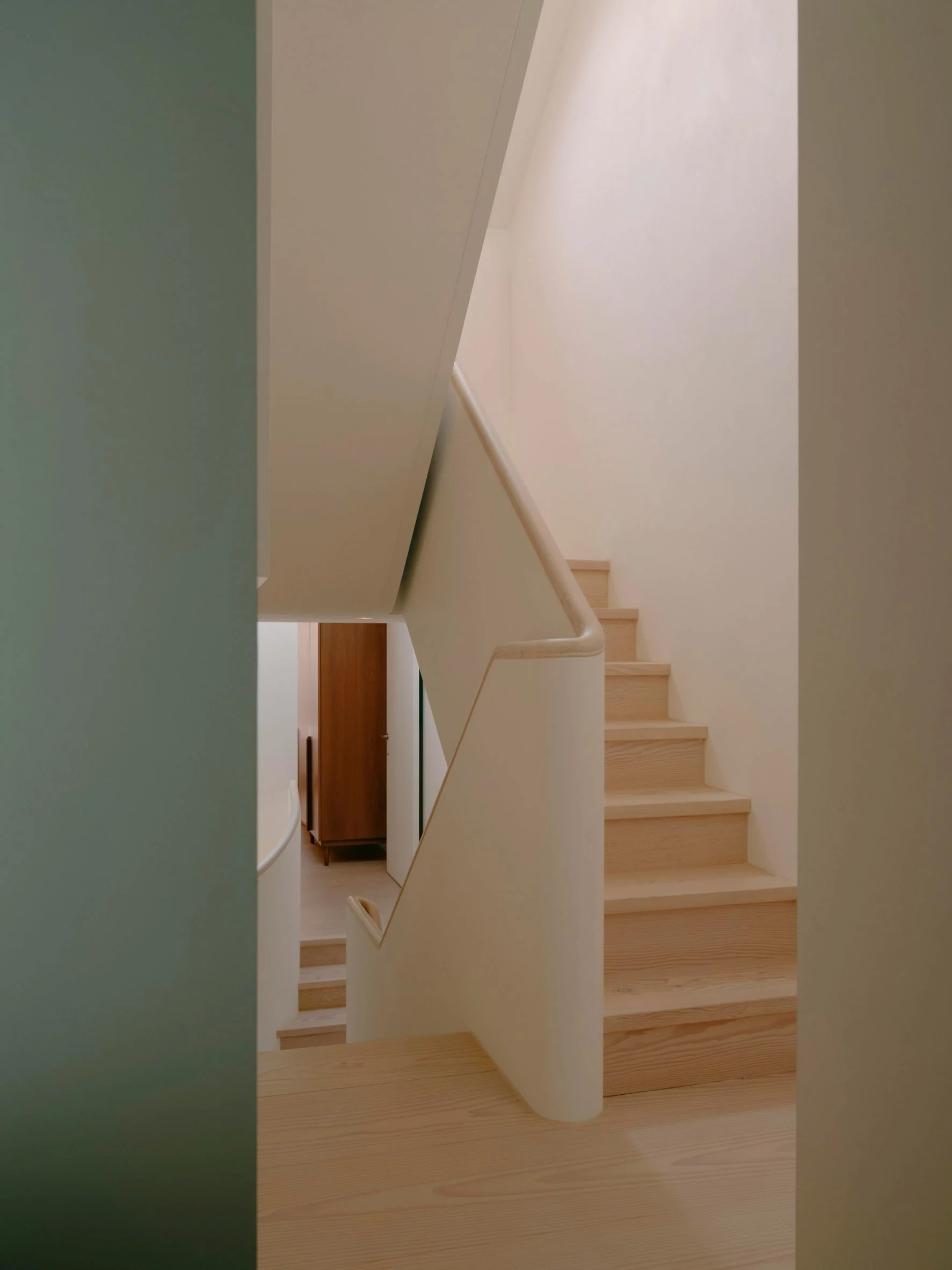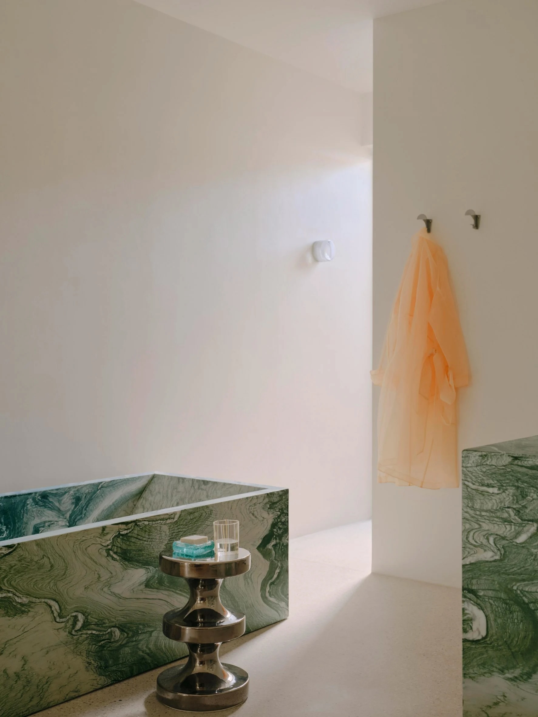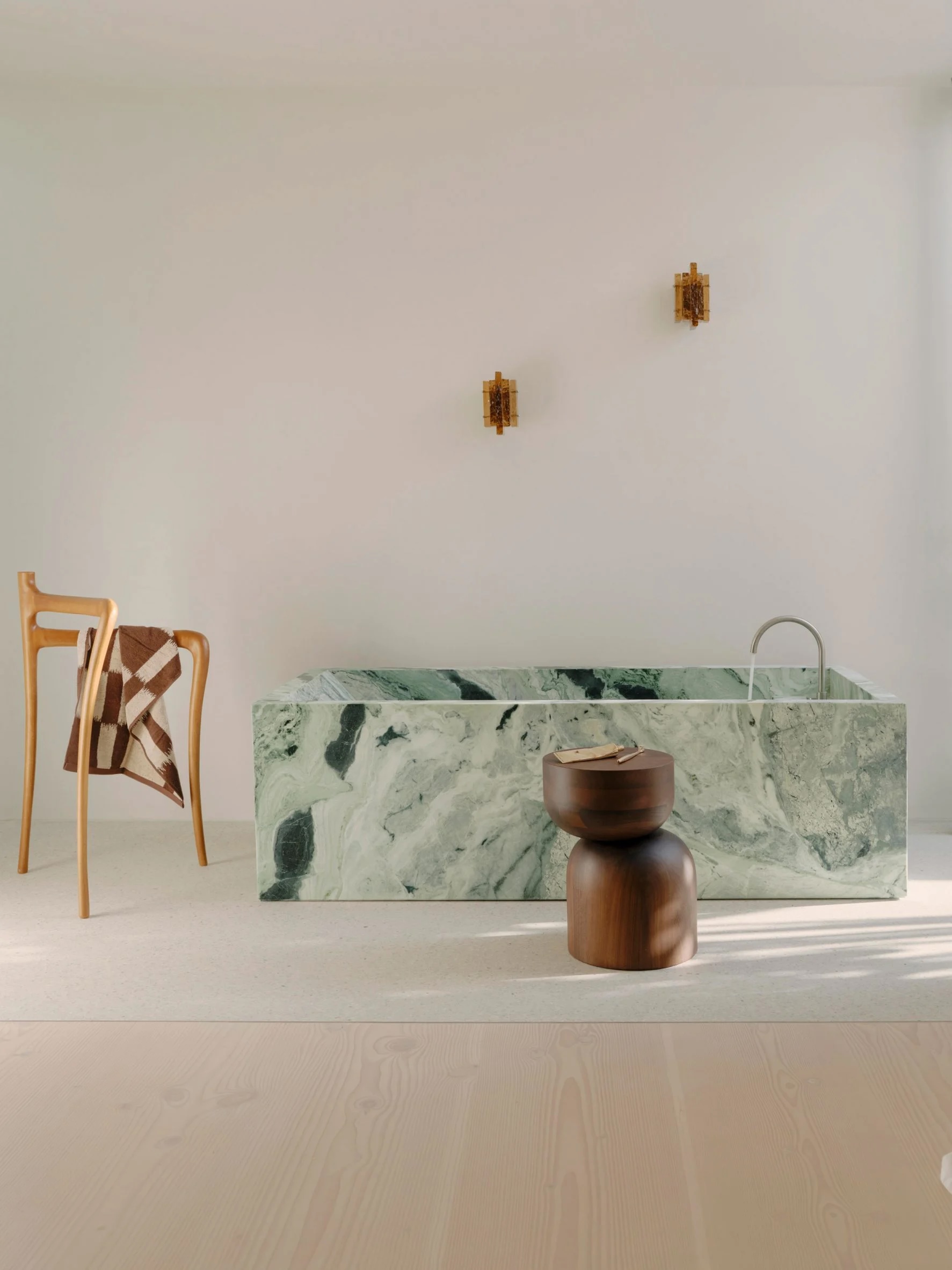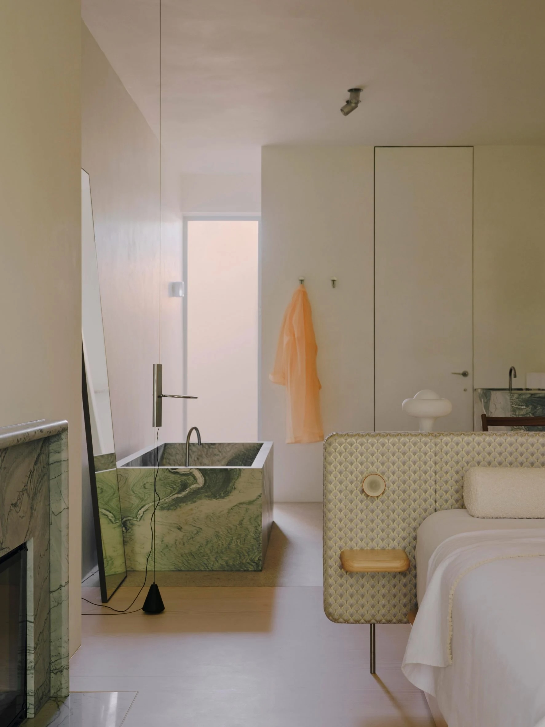 La chambre principale dispose d’une baignoire en marbre vert épais, faisant écho à la tête de lit en pierre surdimensionnée du lit, et d’appliques décoratives en verre dans une teinte ambrée. Des accents de bois se retrouvent dans toutes les pièces, notamment des armoires en sapin de Douglas lisse et des rampes en bois clair. Chaque cabine de douche est éclairée par son propre puits de lumière, ce qui, selon Goodwin, renforce l’atmosphère « harmonieuse » de la maison.