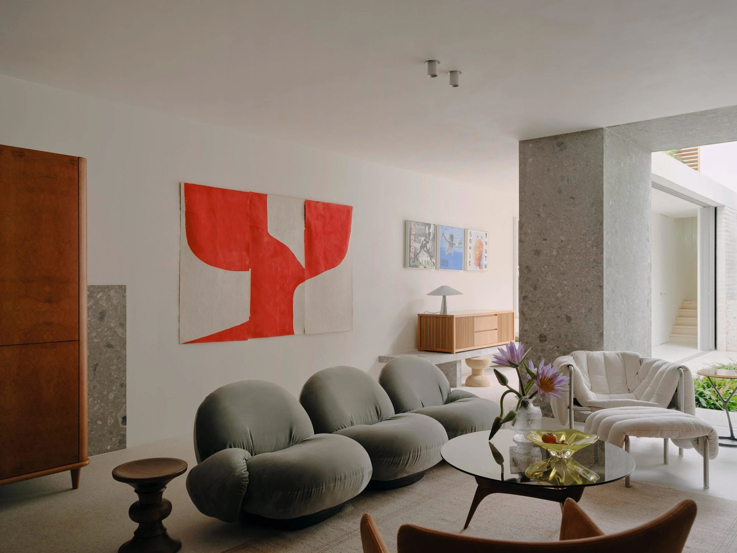 Le salon est caractérisé par des sièges gonflés. On y trouve un canapé trois places, créé en 1975 par le designer de meubles français Pierre Paulin pour Gubi, et le fauteuil Puffy, caractéristique de Faye Toogood pour la marque suédoise Hem.