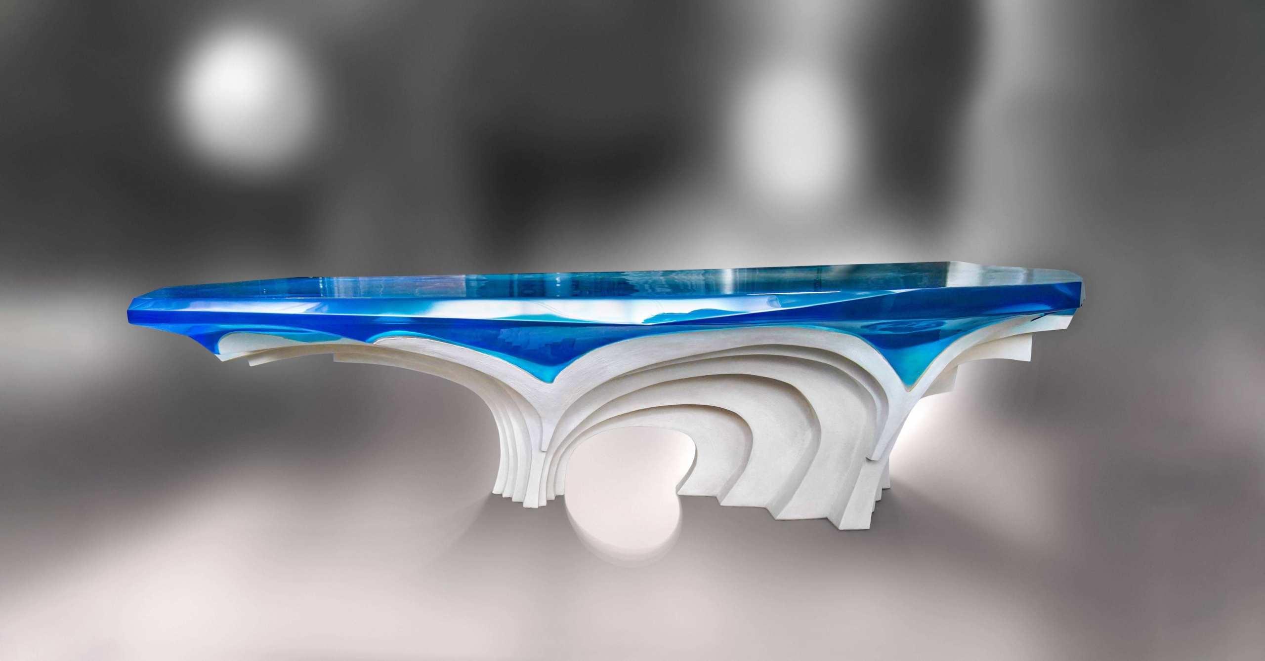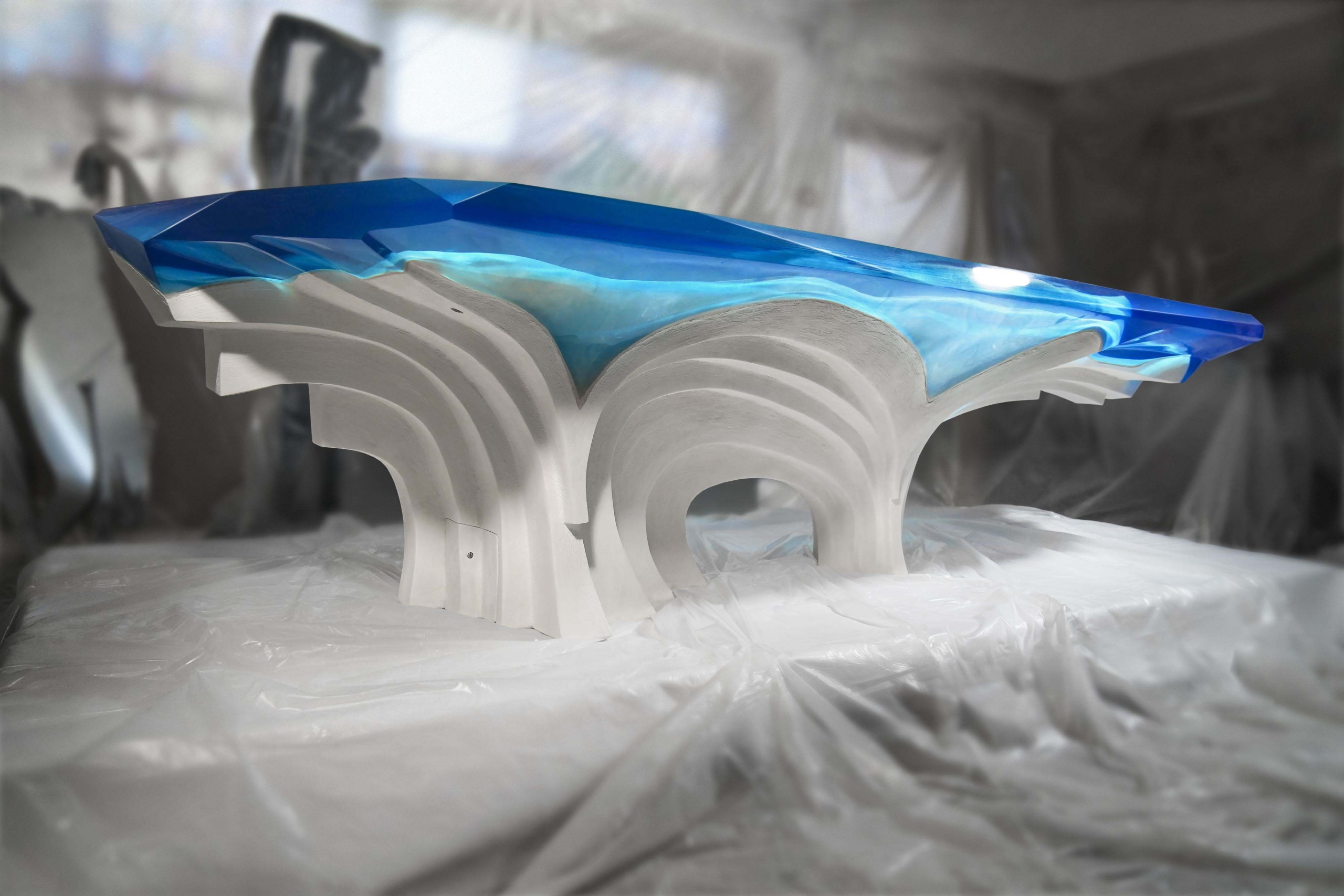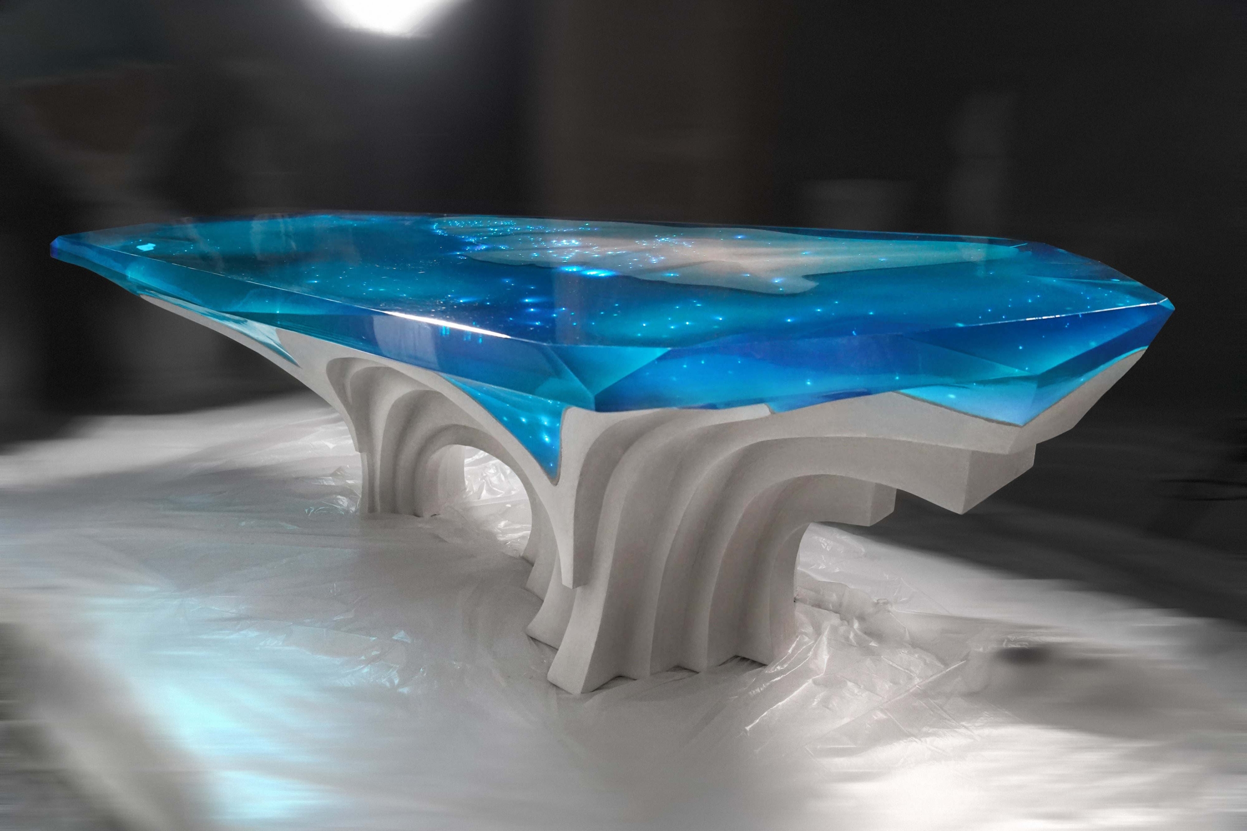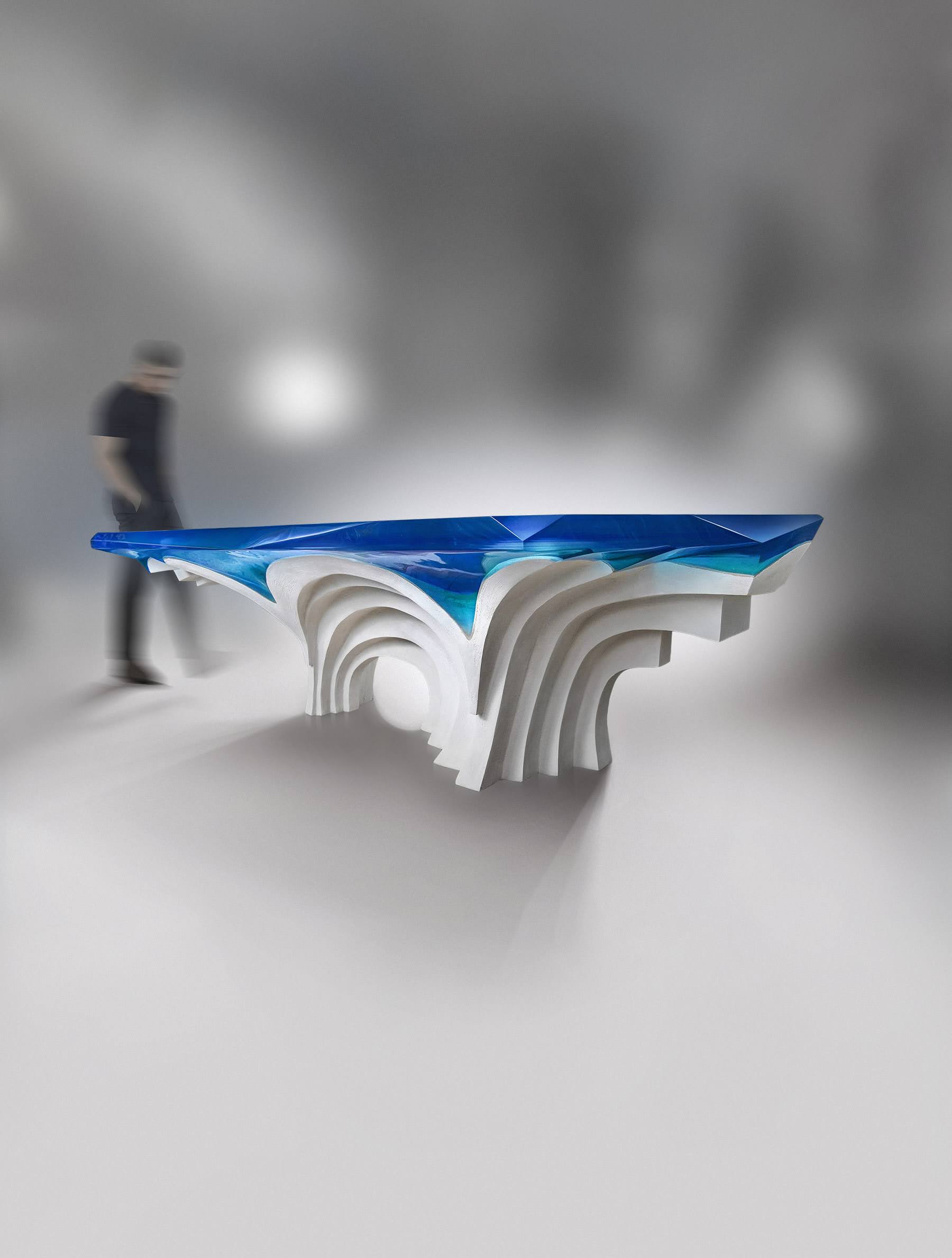 De plus, la table intègre environ 1000 fibres optiques tissées dans sa structure, créant une illumination qui offre un spectre de couleurs vastes et variées. Cette dualité d’éclairage évoque un paysage nocturne côtier, où les frontières entre la terre et la mer se fondent harmonieusement.