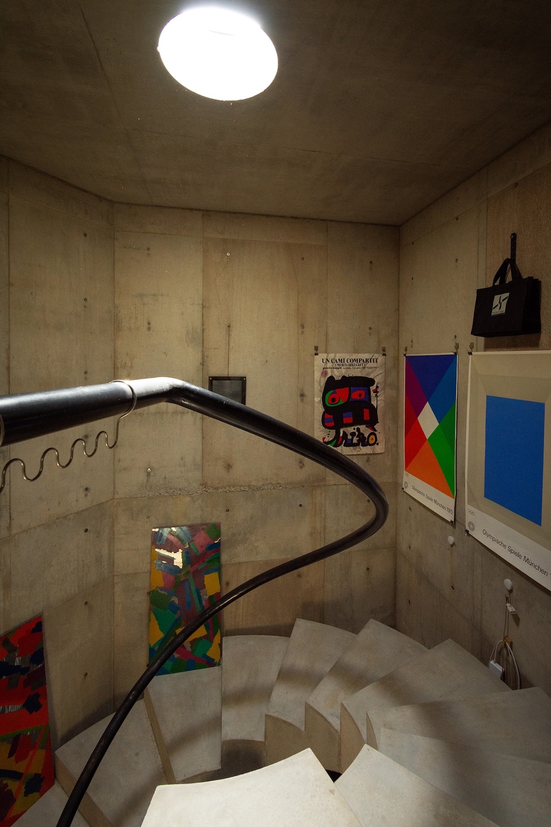 L’élément qui définit la maison est un escalier en colimaçon monumental, occupant la moitié de la surface au sol, non seulement comme circulation mais comme noyau expérientiel. Cette intervention architecturale transforme le mouvement en rituel, brouillant les frontières entre le passage et l’habitation, l’étude et la solitude.