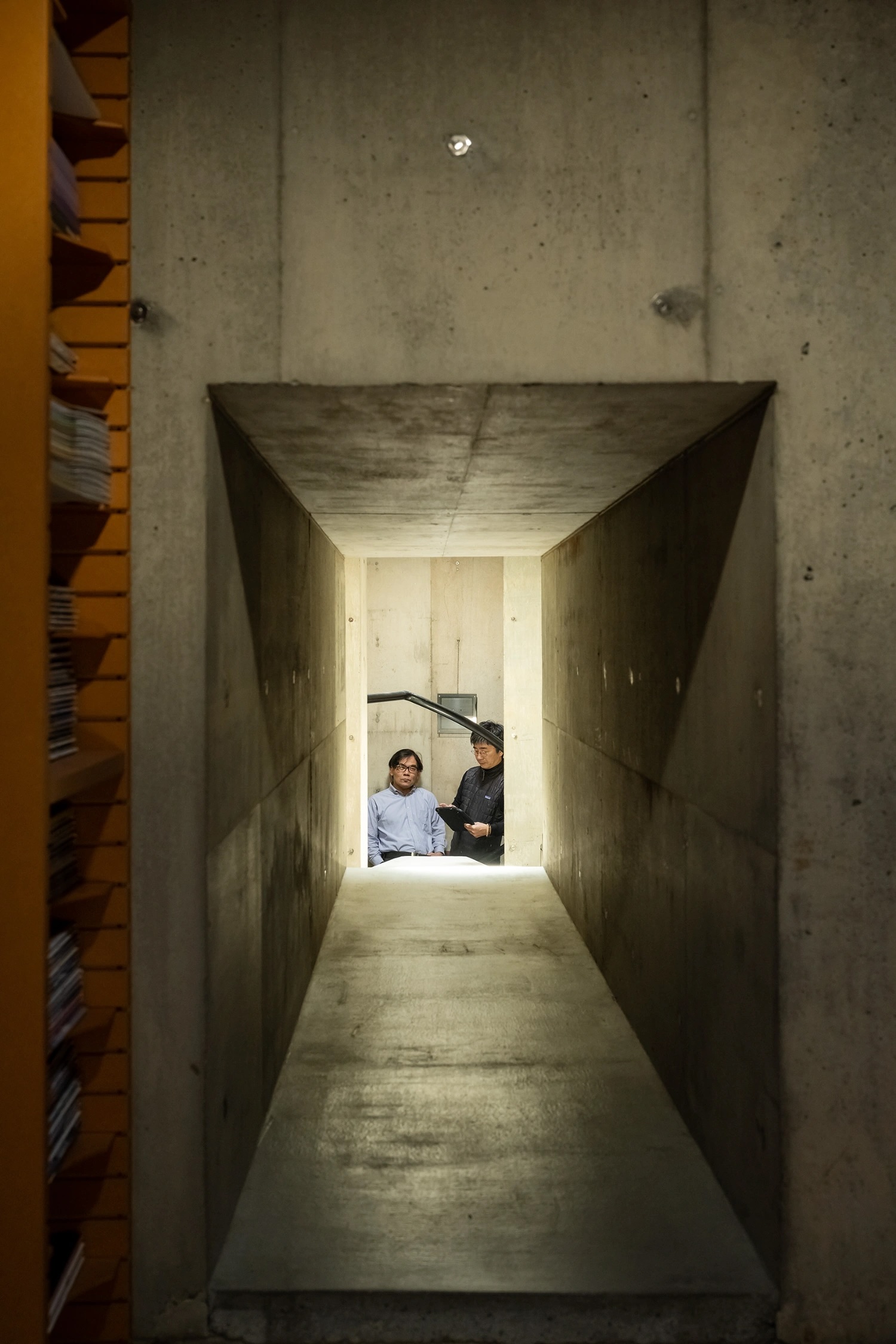 L’interaction entre la lumière et la matérialité renforce encore la complexité atmosphérique de la maison. Cinq puits de lumière distincts modulent la lumière du jour tout au long de la journée et au fil des saisons, conférant à l’enceinte en béton une qualité dynamique, presque vivante.