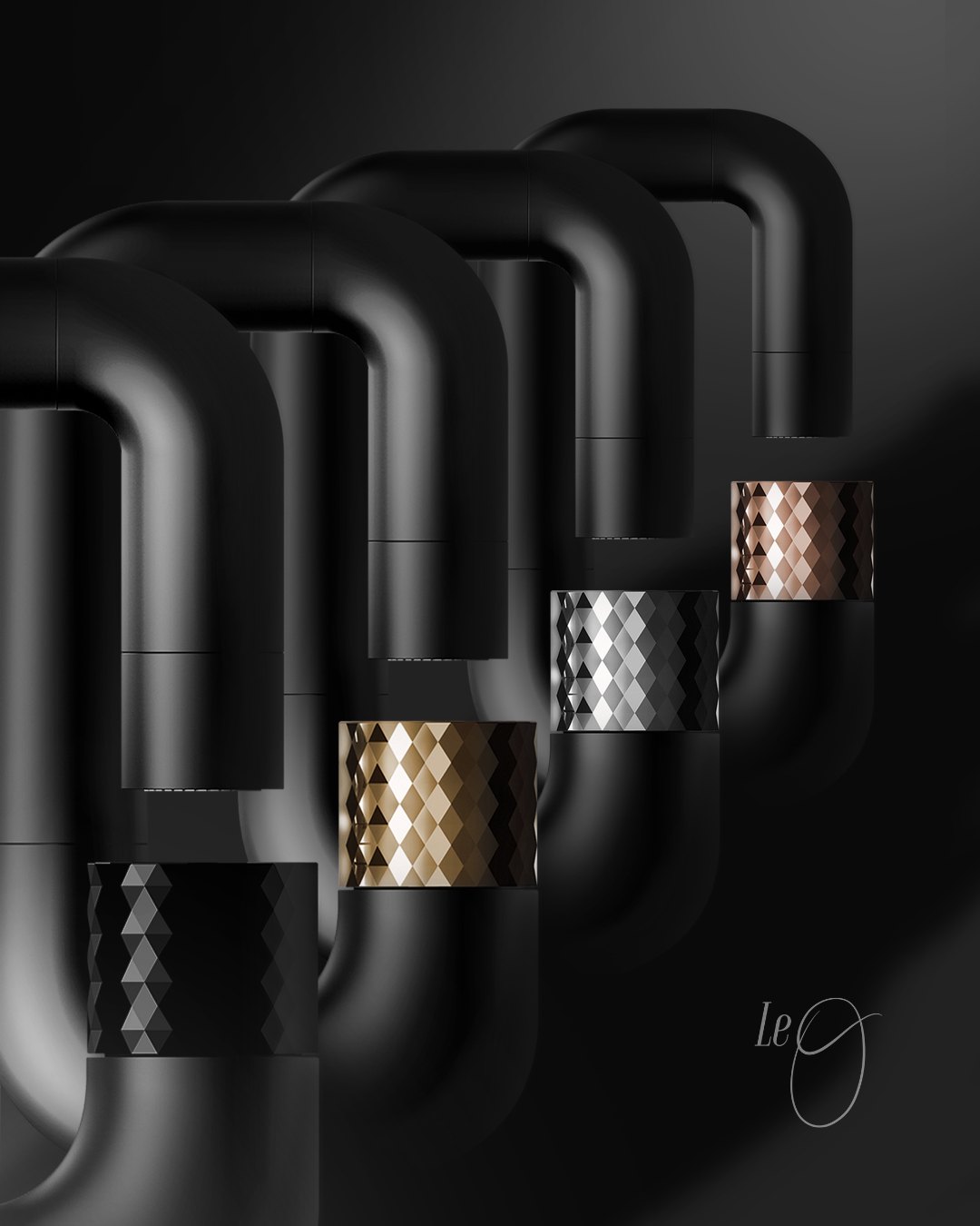 La gamme « Le O » mise sur un design minimaliste et sophistiqué, avec un revêtement noir mat et un bouton poussoir ciselé façon diamant, disponible en plusieurs finitions : chromé, or, or rose ou noir. Chaque robinet est personnalisable, permettant à l’utilisateur de créer un objet unique, fabriqué en France.