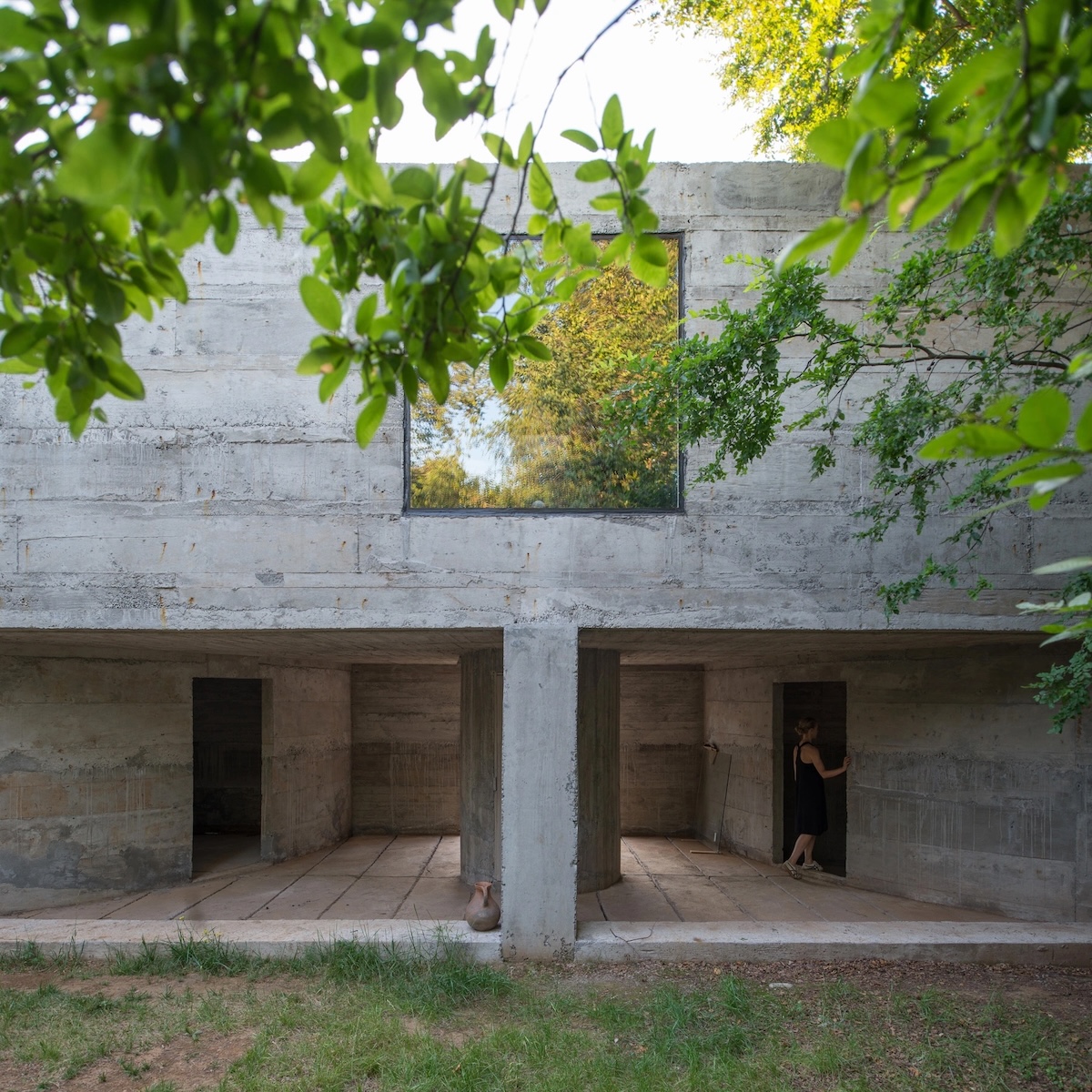 Situé au pied des Andes, cet ensemble en béton est fragmenté mais unifié, avec des joints sismiques soulignant subtilement ses différents volumes. La géométrie disciplinée de l’architecture – une empreinte carrée coupée en deux par une croix asymétrique – crée une logique spatiale rigoureuse, organisant les pièces à la fois le long de la périphérie et au centre.