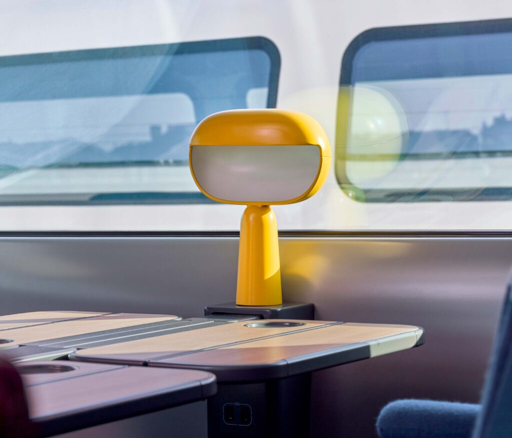 Chaque TGV a eu sa lampe ; on était évidemment des fans de la dernière en date, dessinée par Ionna Vautrin puis éditée pour nos intérieurs par Moustache. Celle du nouveau TGV INOUI, imaginée par Nendo et AREP, se démarque : une sphère jaune douce, presque ludique, trône sur les tables. Elle devient le symbole d’un design fonctionnel mais joyeux, apportant une touche de couleur vive et une signature visuelle forte.